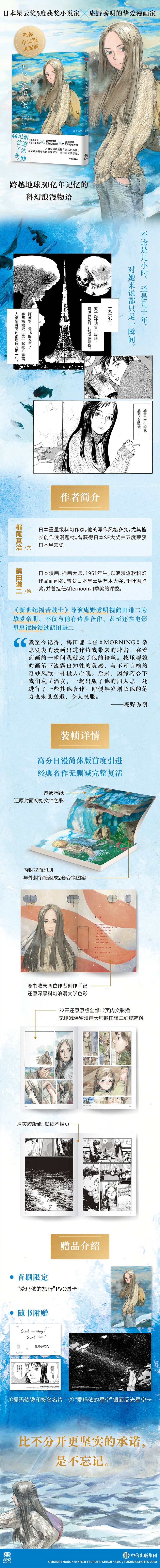 无 日本星云奖5度获奖小说家×日本星云奖4度获奖漫画家 经典名作无删减完整复活 厚质棉纸还原封面初始文件色彩 内封双面印刷,与外封衔接组成2套变换图案 随书收录两位作者创作手记 还原深厚科幻浪漫文学色彩 32开还原原版全部12页内文彩插 无删减保留漫画大师鹤田谦二细腻笔触 首刷限定:“爱玛侬的旅行”PVC透卡 随书附赠:①“爱玛侬的星空”银面反光星空卡 ②爱玛侬烫印签名名片