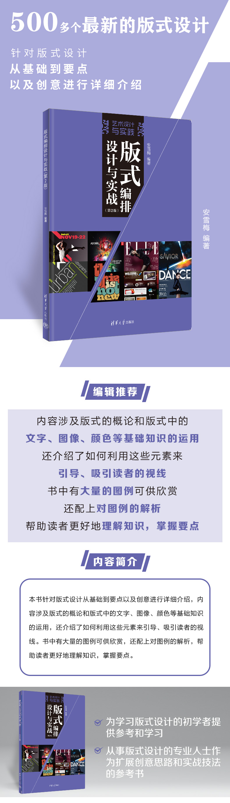 版式编排设计与实战(第2版艺术设计与实践) 出版时间 2022-08-01T00:00 其他类别 60024 作者: 编者:安雪梅|责编:陈绿春 出版社: 清华大学 原售价: 49.00 折扣价: 34.79 折扣购买: 版式编排设计与实战(第2版艺术设计与实践) ISBN: 9787302612278 作者简介 内容简介 内容涉及版式的概论和版式中的文字、图像、颜色等基础知识的运用,还介绍了如何利用这些元素来引导、吸引读者的视线。书中有大量的图例可供欣赏,还配上对图例的解析,帮助读者更好地理解知识,掌握要点 上一篇:财经应用文写作(第3版21世纪经济与管理精编教材)/经济学系列下一篇:土木工程项目管理(全国高等院校土木工程类系列教材)