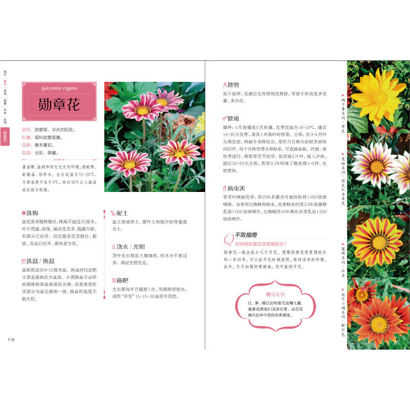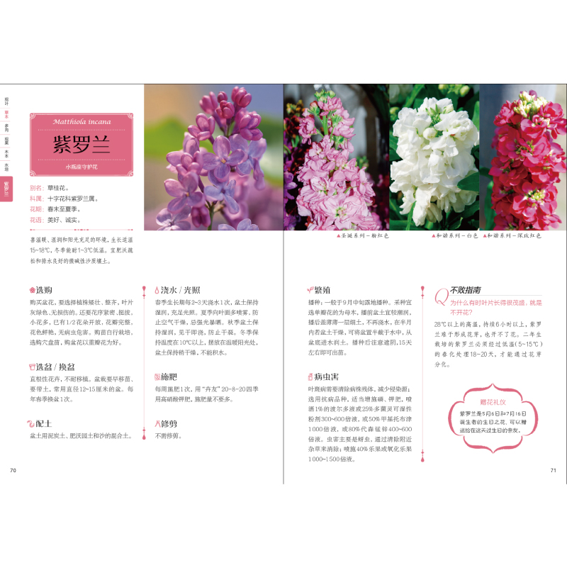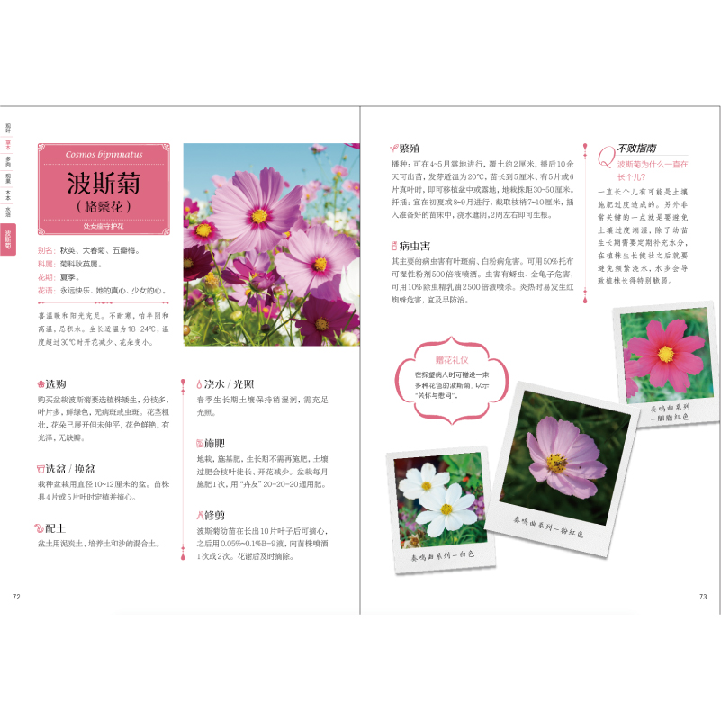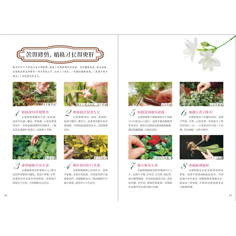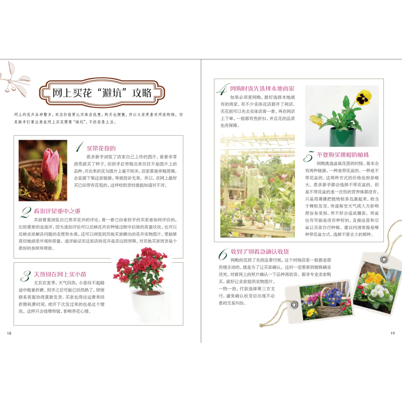 选购爱花的小窍门 无论是幼苗、半成品花或成品花,每一个品种都有不同的特性,但也有共同的选购标准,只要掌握窍门,就能买到优质苗株,在养护过程中起到事半功倍的效果。 请懂行朋友来把关 在国内花市上,由于盆栽花卉商品标准化程度很低,出售的苗株有的只有一个中文名字,印在包装纸或贴在盆钵容器上,没有标准的花卉学名和品种名,更多的是摊主给顾客报一个好听的商品名。因此选购时必须谨慎,尤其是没有开花的苗株或种球,更难辨别其真伪。由此,若要选购价位较高的商品苗株,最好请一位懂行的朋友把关。另外,有些苗株虽然是真的,但因为是临时栽的不服盆或是没有根的“盆栽商品”,买回家也是很难养活或养好的,不建议购买。 购买完整无缺的苗株 选购苗株的第一感觉是株态好,完整无缺。所谓株态好,就是植株形态或树冠端正,不东倒西歪,枝叶分布匀称,看上去很舒服,顶部完好,没有缺枝或断枝;叶片排列有序,大小匀称,无缺叶、断叶或虫咬叶,刺、毛完整无损;花序完整不掉花,花朵完整不缺瓣,花瓣完整无缺损;挂果匀称,分布均匀,果实发育正常,无畸形、无掉果、无缺损和伤痕。 挑选新鲜健康的植株 苗株的茎部挺拔,不萎蔫,皮色纯正,无污斑;叶色青翠欲滴,没有黄叶、枯叶,刺、毛有光泽;花朵丰满,色彩鲜艳,斑纹清晰,有光泽;果实饱满,色泽光亮。 观察发育成熟度 根据生长发育程度,植株大致分为幼苗、半成品花和成品花3类。幼苗,一般指穴盘苗或草本花卉播种出苗后经1次或2次移栽的苗;木本花卉播种后出现2片或3片真叶的苗或扦插生根苗、嫁接成活苗等。半成品花,常指没有上市,但基本定型的苗株,有的已现蕾或含苞待放。成品花,指已上市的盆栽花木,建议衡量后购买成品花,因为已有1~3朵花初开或露色初开(指单朵品种)能够识别花色、品种。 观叶和多肉盆栽购买时间有讲究 购买时间要根据植物的耐寒程度与本地气候来定。以长江流域为准,耐寒性强的观叶植物,如常春藤、苏铁、竹柏等,除冬季严寒时以外,都可以购买。对一些耐寒性稍差的观叶植物和多肉植物,如发财树、鹅掌藤、鹿角蕨、山地玫瑰、熊童子、芦荟等,最好在春季4~5月购买,此时气温趋向稳定,可拥有较长的观赏时间。对那些原产热带地区,在高温、高湿条件下生长的观叶植物和多肉植物,如合果芋、绿萝、竹芋、龙血树、仙人掌等,要在6月初夏时购买,此时的气温、空气湿度都比较接近其原产地,植株恢复快,容易萌发新叶。观叶植物切忌在秋冬季购买,入室后由于温湿度的差异,往往难以恢复,叶片容易黄化、枯萎。 观花和观果盆栽的四季选购 春季选购报春花、瓜叶菊等草花,要选1/2小花已经开放的盆花,不要购买幼苗,一是养护期较长,管理麻烦;二是在室内环境难以栽培好。 夏季选购凤仙花、矮牵牛、勋章花等草花,要求植株紧凑、矮壮,叶色深绿并有花球和花苞的盆花。买回可直接欣赏,观花期也长。 秋季选购草本花卉,如长春花、天竺葵等,要求株形矮壮、丰满,叶色深绿,花朵整齐。 冬季选购丽格秋海棠、仙客来、蟹爪兰等,以花朵初开为好。选购观果植物也以冬季挂果的植株为好,如金橘、冬红果、朱砂根等,挂果越多,营造的吉庆气氛越浓厚。 春夏秋冬,这样浇水才靠谱 植物的一切生命活动都离不开水的参与,如光合作用、呼吸作用、蒸腾作用,以及营养物质的吸收、运转和合成等。水的作用能维持细胞的膨压,使枝条挺拔、叶片开展、花朵丰满。同时,植物还依靠叶面的水分蒸腾来调节本身体温。花卉种类繁多,由于原产地环境条件差异很大,季节变化不一样,因此需水量的多少也不尽相同。 春季养根逐渐增加浇水量 应根据气温的变化,逐渐增加浇水量。草本花卉保持土壤湿润,但不能积水,否则根部易出现褐化、腐烂。养根最关键的问题在于做好浇水工作,水大或缺水都易导致坏根现象发生。木本花卉必须在两次浇水中间有一段稍干燥的时间。草本花卉每周浇水1次或2次,木本花卉7~10天浇水1次。 夏季宜在早晨和傍晚浇水 气温升高,花草对水分的需求也相应增加,加强水分补充,不仅可以保证花草健壮生长,还能达到降温增湿的效果。浇水以早晨和傍晚为宜,不要中午浇冷水。草本花卉每1~2天浇水1次,高温时每天浇水1次或2次。多年生宿根花卉,每周浇水2次或3次。球根花卉高温时每周浇水1次或2次。水生花卉不能脱水。盆栽木本花卉,发现2~3厘米深的盆土已出现干燥,则立即浇水。观叶植物早晚适当向叶面喷雾。夏季室外养护,多数花卉要防大雨积水,地栽花卉雨后应及时排水。 秋季注意及时补充水分 秋季气温开始下降,日温差逐渐加大,雨水明显减少,天晴日数增多。草本花卉茎叶水分蒸发量较大,需要及时补充水分,以防叶片凋萎影响生长和开花。一般来说处于休眠中的植物,即便是在秋季也要注意浇水量的控制,盆栽需要保持土壤湿润,并向叶面喷雾,保持较高的空气湿度。 冬季水温尽量接近室温 冬季给室内花草浇水,必须视室温的变化来调节。北方室内环境干燥,可以向叶面喷雾,北方水呈碱性,最好酸化后再浇花,可以贮存雨水浇花或者用稀释后的硫酸亚铁矾肥水增加空气湿度。长江流域地区一般浇水不要过多,浇水间隔的时间要视室温变化而定。浇水以晴天中午为宜,水温尽量接近室温。若花草已经进入冬季休眠期,其根部对水肥的吸收缓慢,盆土不干不