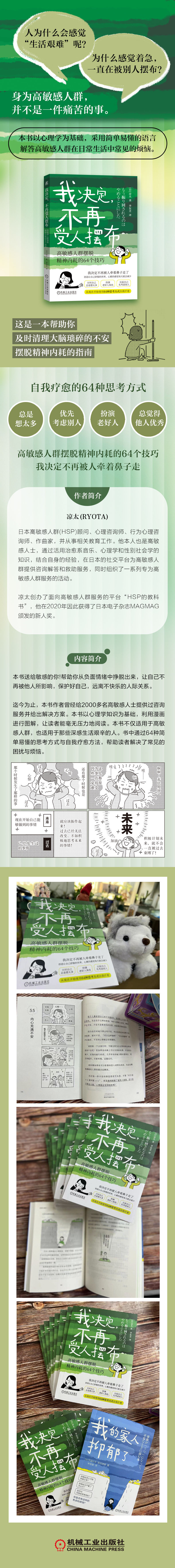 1.专业性与亲和力的结合:本书由拥有丰富咨询经验的作者撰写,基于深厚的心理学知识,专为高敏感人群量身定制。同时,通过漫画图解的方式,使复杂的心理学理论变得生动有趣,易于理解,让读者在轻松愉快的氛围中学习成长。 2.全面覆盖的解决方案:书中提供了64种精心设计的思考方式与自我疗愈方法,全面覆盖高敏感人群在日常生活中可能遇到的各种困扰与烦恼,如情绪管理、人际关系处理、自我认同建立等,帮助读者系统地解决问题,实现自我提升。 3.普适性广,受众广泛:虽然聚焦于高敏感人群,但书中的内容同样适用于所有深感生活压力、渴望自我成长和改变的人。无论你是性格内向还是外向,都能从中找到共鸣与帮助。 4.实践性强,效果显著:每一种方法都旨在引导读者进行实际操作,通过简单的步骤和练习,逐步改善自己的心理状态和人际关系,最终实现不再受人摆布,自主掌握生活的目标。