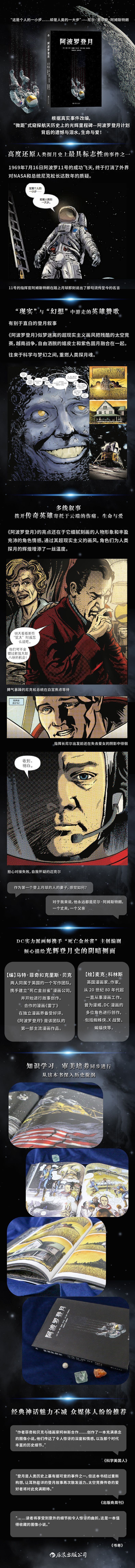 人类史上蕞具标志性、蕞大胆的历史事件之一 “这是个人的一小步,却是人类的一大步。” 1969年,阿波罗11号的指挥长尼尔·阿姆斯特朗在踏上月球的那一刻说出了这句经典名言。阿波罗登月取得了前所未有的成功,将整个人类的航天技术推向了顶峰。同时也奠定了人类对未来探索太空的雄心。从此,月球之于现代人有了全新的意义。距今为止,即使过去了半个多世纪,人们依旧会惊叹这项任务的伟大。 在“现实”与“幻想”中游走的英雄赞歌 《阿波罗登月》不同于以往平铺直叙的登月叙事。从太空竞赛、政治阴谋、越南战争,到似梦迷离的超现实主义风格:太空中的嬉皮士、巨大的月亮脸等……高度还原的历史事实与梦幻般的想象力戏剧性地糅合在一起,让登月成为人类在无垠的宇宙中留下的浪漫,重燃探月魂。 如电影般丰富的多线叙事结构 除了历史事件和幻想之外,《阿波罗登月》还加入了一些细碎的人物情感线。脾气暴躁的尼克松总统在白宫里局促不安,心思细腻的指挥长尼尔还未从失去爱女的痛苦中走出来,巴兹的父亲为了能让儿子第一个登月到处托关系……即使是次要角色也性格鲜明,把人物的心事和挣扎巧妙带出,情感的丰盈也为人类探月的辉煌成就增添了一丝温度。