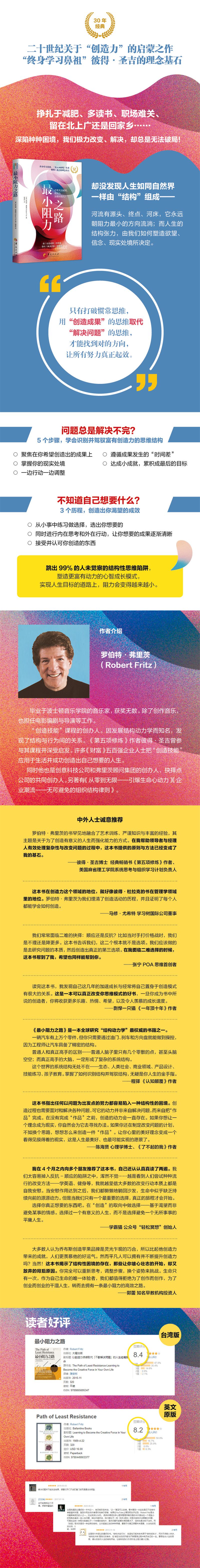 第一章 最小阻力之路 一旦你创造出一个新的 结构,你的生命就会兴起 一股全面性的动力,就像 河水的水力一样,帮你达 成你真正想要的成就。直 接通往那些成就的道路, 就是最小阻力之路…… 路是怎样形成的 波士顿是我的故乡,去 过的朋友常问我:“当年他 们是怎样规划道路的?”波 士顿看来似乎没有都市规 划可言。城里的道路都是 用既有牛径拓建而成的。 但是,这些牛径又是怎 么来的呢? 在地面上移动的牛总是 挑最容易的路走。当牛看 见前方有一座山丘,它不 会对自己说:“啊哈!一座 山丘!我一定要硬闯过去 。”而是会一步步慢慢走, 挑最容易行走的地方,也 许还会避开岩石,走最不 陡的路段。换言之,山路 的结构会决定它的行为。 每当牛通过同样的区域 ,路就会变得比上一头牛 经过时更容易走,因此一 条牛径慢慢成形了。 山路的结构造成了牛在 移动时的固定行为模式。 结果,波士顿的城市样貌 居然是17世纪的牛走出来 的。 顺势而行 一旦某个结构形成了, 能量就会沿着这个结构的 最小阻力之路往下传递。 换言之,能量会沿着最容 易的路线前进。 这一道理不只适用于牛 ,也适用于整个自然界。 河水悠悠,流动时何尝遭 遇什么阻力?当风吹过曼 哈顿的水泥丛林时,也会 经过最小阻力的路径。还 有各种电流,不管是在灯 泡这种简单设备上,还是 在最复杂的电脑里,走的 也是最没有阻力的路径。 如果你看过慢动作摄影 术拍出来的人行道影片, 就会发现行人在忙碌街道 上走动时的模式——他们 会避免挡住彼此的路。有 时候行人最省力的路径是 一直往前走,有时候是靠 左或靠右,有时候是走快 一点,有时候则是放慢速 度,或者稍待片刻。 无论如今你走到了怎样 的人生境界里,当初一定 是沿着最小阻力之路走出 来的。 生命的三大洞见 这本书建立在三大洞见 的基础上。第一个洞见是 :你的生命就像一条河。 你所走的人生道路都是最 小阻力的。而且我们都一 样——不管是人类,还是 自然界的其他事物。 也许你想改变某些生活 领域里的流动方向,例如 饮食习惯、工作习惯、与 人交往的模式、对待自己 的方式,还有你对于生活 的态度。虽然你可以在短 时间内成功改变习惯,但 你会发现,自己最后还是 回到了原来的行为模式或 态度。这是因为你的人生 已经被决定了,而挑选最 小阻力之路是你必须遵循 的自然法则。 另一个洞见也十分重要 :最小阻力之路是由你生 活中的潜藏结构决定的。 就像波士顿周遭的地形决 定了牛的最小阻力之路, 河床决定了河流的路径。 不管你是否意识到,这种 结构都是存在的。不管是 否有河水经过,河流的结 构都是一样的。 也许你几乎没有注意到 自己的生活里有结构存在 ,也不知道它们深具影响 力,理所当然地决定了你 的生活方式。 许多人每天以一样的方 式过活,却又常常感到无 力与挫折。他们企图做出 重大决定,改变自己的情 感生活、职业、家庭关系 、健康或是生活品质,却 在不久后发现,他们又回 到了老地方。他们又开始 遵循那些根深蒂固的旧有 模式。 P2-4 人生如同自然界一样由“结构”组成。河流有源头、终点、河床,它永远朝阻力最小的方向流淌;而人生的结构张力,由我们如何塑造欲望、信念、现实处境所决定。 只有打破惯常思维,用「创造成果」的思维取代「解决问题」的思维,才能找到对的方向,让所有努力真正起效。