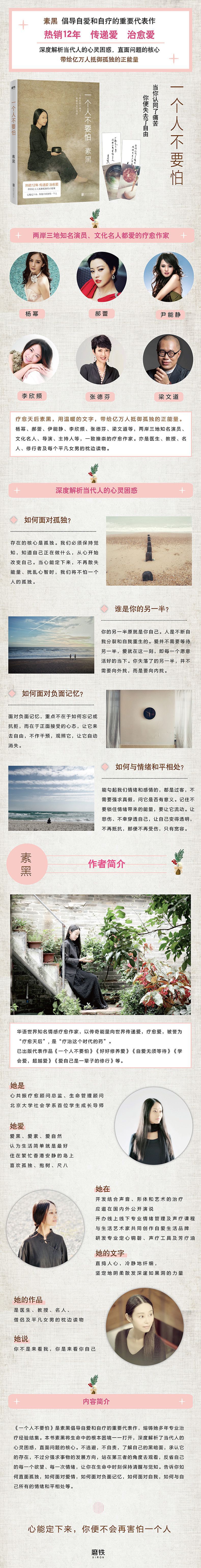 \"素黑 华语世界知名情感疗愈作家,以传奇能量向世界传递爱,疗愈爱,被誉为“疗愈天后”, 是“疗治这个时代的药”。已出版代表作品《一个人不要怕》《好好修养爱》《自爱无须等待》《学会爱,超越爱》《爱自己是一辈子的修行》等。 她是 心共振疗愈顾问总监、生命管理顾问 北京大学社会学系首位学生成长导师 她爱 爱黑、爱素、爱自然 认为生活简单就是最好 住在繁忙香港安静的岛上 喜欢孤独、抱树、尺八 她在 开发结合声音、形体和艺术的治疗 应邀在国内外公开演说 开办线上线下专业情绪管理及声疗课程 与生活艺术家共同创作自爱生活品牌 研发专业定心铜磬、声疗工具及芳疗油 她的文字 直捣人心,冷静地纤细,坚定地阴柔 散发深邃如黑洞的力量 她的作品 是医生、教授、名人、僧侣及平凡女男的枕边读物 她说 你不是来看我,你是来看你自己\"