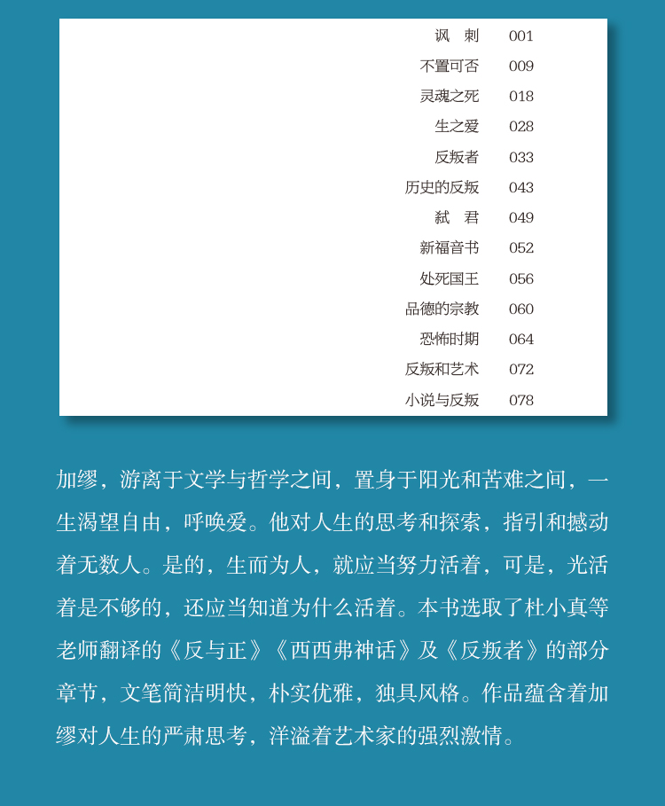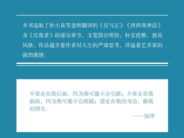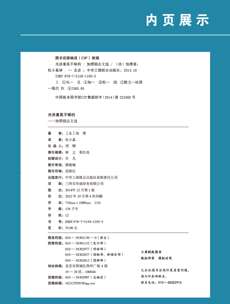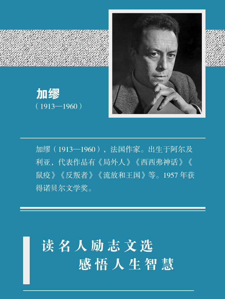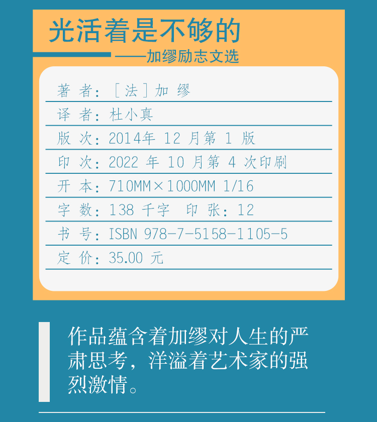 光活着是不够的 : 加缪励志文选 出版时间 0002-11-30T00:00 其他类别 25458 作者: (法)加缪 著;杜小真 译 出版社: 工商联 原售价: 35.00 折扣价: 10.85 折扣购买: 光活着是不够的 : 加缪励志文选 ISBN: 978751581105501 作者简介 内容简介 上一篇:能源概论(第2版高等学校十三五规划教材)下一篇:高校管理审计研究