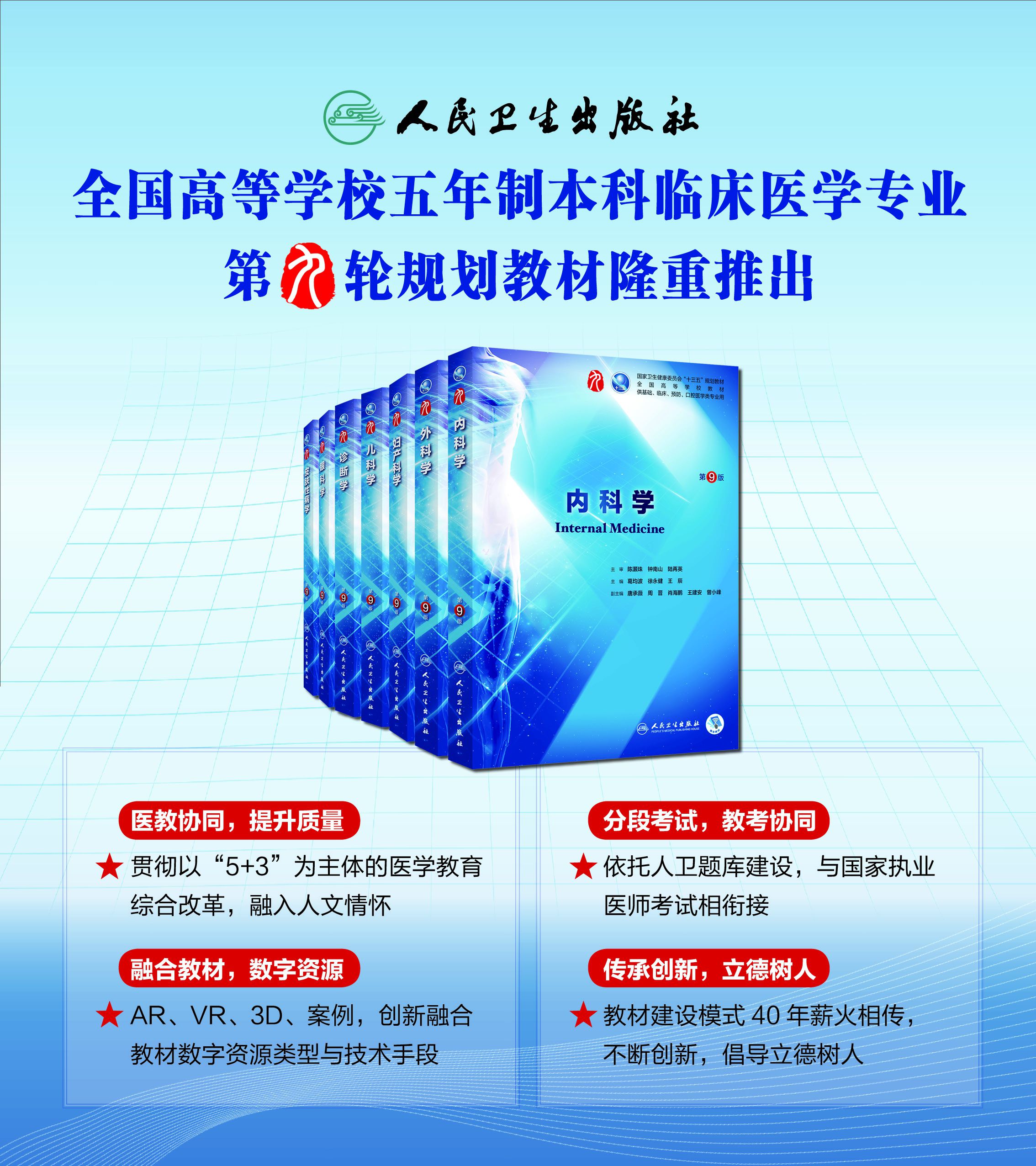 第九轮教材共有 53 种,均为国家卫生健康委员会“十三五”规划教材。全套教材将于 2018 年 6 月出版发行,数字内容也将同步上线。教育部副部长林蕙青同志亲自为本套教材撰写序言, 并对通过修订教材启发和指导高校不断深化医学教育改革、进一步推进医教协同,为培养高质量医 学人才、服务人民群众健康乃至推动健康中国建设寄予厚望。希望全国广大院校在使用过程中能 够多提供宝贵意见,反馈使用信息,以逐步修改和完善教材内容,提高教材质量,为第十轮教材的 修订工作建言献策。