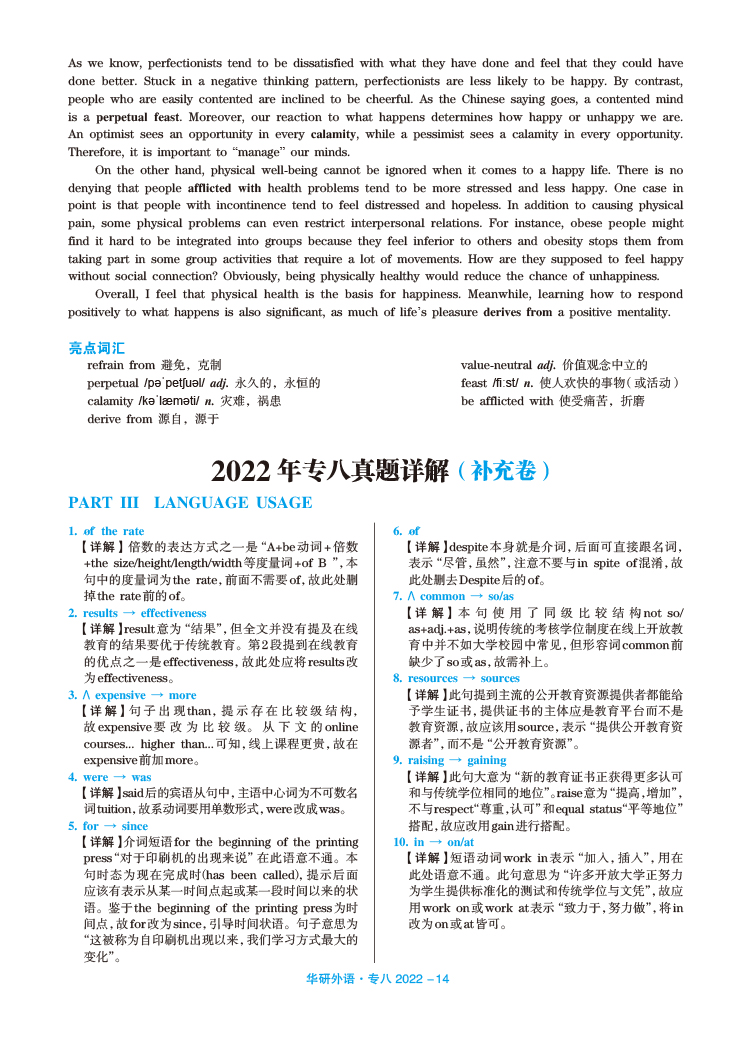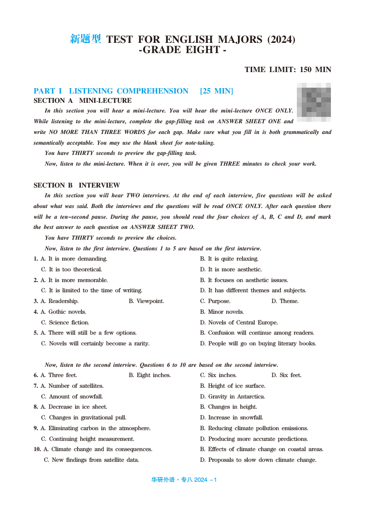 新题型 TEST FOR ENGLISH MAJORS (2024) - GRADE EIGHT - TIME LIMIT: 150 MIN PART I LISTENING COMPREHENSION [25 MIN] SECTION A MINI-LECTURE In this section you will hear a mini-lecture. You will hear the mini-lecture ONCE ONLY. While listening to the mini-lecture, complete the gap-filling task on ANSWER SHEET ONE and write NO MORE THAN THREE WORDS for each gap. Make sure what you fill in is both grammatically and semantically acceptable. You may use the blank sheet for note-taking. You have THIRTY seconds to preview the gap-filling task. Now listen to the mini-lecture. When it is over, you will be given THREE minutes to check your work. SECTION B INTERVIEW In this section you will hear TWO interviews. At the end of each interview, five questions will be asked about what was said. Both the interviews and the questions will be read ONCE ONLY. After each question there will be a ten-second pause. During the pause, you should read the four choices of A, B, C and D, and mark the best answer to each question on ANSWER SHEET TWO. You have THIRTY seconds to preview the choices. Now, listen to the first interview. Questions 1 to 5 are based on the first interview. 1. A. It is more demanding. B. It is quite relaxing. C. It is too theoretical. D. It is more aesthetic. 2. A. It is more memorable. B. It focuses on aesthetic issues. C. It is limited to the time of writing. D. It has different themes and subjects. 3. A. Readership. B. Viewpoint. C. Purpose. D. Theme. 4. A. Gothic novels. B. Minor novels. C. Science fiction. D. Novels of Central Europe. 5. A. There will still be a few options. B. Confusion will continue among readers. C. Novels will certainly become a rarity. D. People will go on buying literary books. Now, listen to the second interview. Questions 6 to 10 are based on the second interview. 6. A. Three feet. B. Eight inches. C. Six inches. D. Six feet. 7. A. Number of satellites. B. Height of ice surface. C. Amount of snowfall. D. Gravity in Antarctica. 8. A. Decrease in ice sheet. B. Changes in height. C. Changes in gravitational pull. D. Increase in snowfall. 9. A. Eliminating carbon in the atmosphere. B. Reducing climate pollution emissions. C. Continuing height measurement. D. Producing more accurate predictions. 10. A. Climate change and its consequences. B. Effects of climate change on coastal areas. C. New findings from satellite data. D. Proposals to slow down climate change. 适用对象: 需要专八真题自测的考生;基础一般、需要强化作文和词汇的考生;专八培训班师生。 推荐理由: 1. 真题专业解答,由专四专八命题中心上海外国语大学名师主审,校正同类专八真题多处错误; 2. 真题试卷汇编,包含补充卷,全国考生通用; 3. 题量丰富,含10套专八级真题+专项基础训练64篇; 4. 解析独立成册,方便对照学习。详细透彻,一针见血点评考点,阅读文章提供全文翻译、难句分析、词汇注释、干扰项排除,让学生复习更高效; 5. 赠专八高频词汇,方便临考突击; 6. 真题音频均为考场原音,扫码获取,可在线听,可下载,可倍速,练习更方便; 7. 附赠专八精选课程。