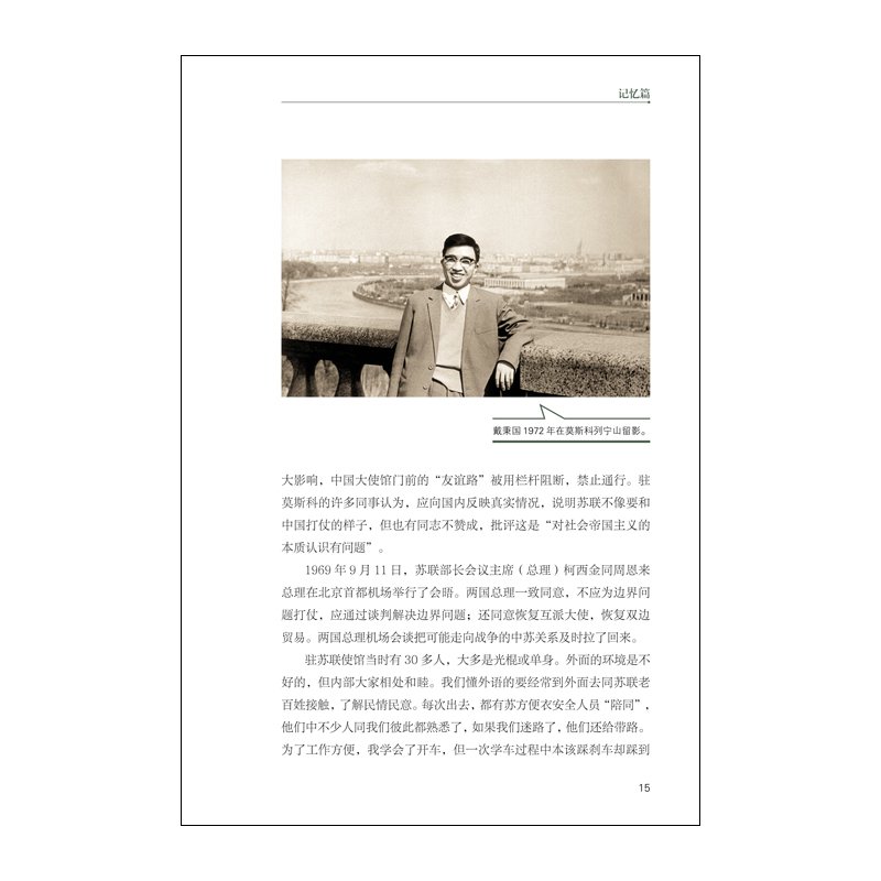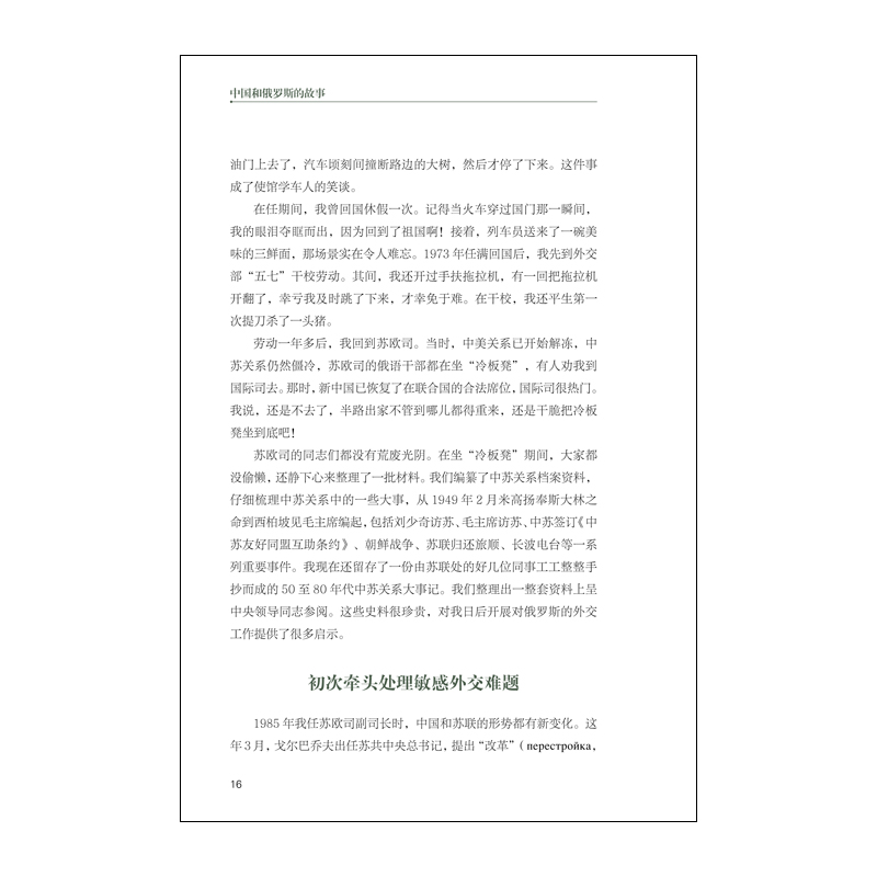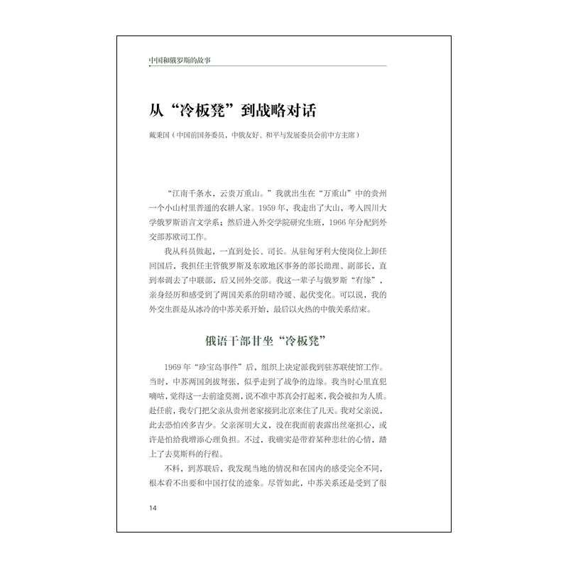 从“冷板凳”到战略对话 戴秉国 (中俄友好、和平与发展委员会前中方主席,中国前国务委员) “江南千条水,云贵万重山。”我就出生在“万重山”中的贵州一个小山村里普通的农耕人家。1959年,我走出了大山,考入四川大学俄罗斯语言文学系;然后进入外交学院研究生班,1966年分配到外交部苏欧司工作。 我从科员做起,一直到处长、司长。从驻匈牙利大使岗位上卸任回国后,我担任主管俄罗斯及东欧地区事务的部长助理、副部长,直到奉调去了中联部,后又回外交部。我这一辈子与俄罗斯“有缘”,亲身经历和感受到了两国关系的阴晴冷暖、起伏变化。可以说,我的外交生涯是从冰冷的中苏关系开始,最后以火热的中俄关系结束。 俄语干部甘坐“冷板凳” 1969年“珍宝岛事件”后,组织上决定派我到驻苏联使馆工作。当时,中苏两国剑拔弩张,似乎走到了战争的边缘。我当时心里直犯嘀咕,觉得这一去前途莫测,说不准中苏真会打起来,我会被扣为人质。赴任前,我专门把父亲从贵州老家接到北京来住了几天。我对父亲说,此去恐怕凶多吉少。父亲深明大义,没在我面前表露出丝毫担心,或许是怕给我增添心理负担。不过,我确实是带着某种悲壮的心情,踏上了去莫斯科的行程。 不料,到苏联后,我发现当地的情况和在国内的感受完全不同,根本看不出要和中国打仗的迹象。尽管如此,中苏关系还是受到了很大影响,中国大使馆门前的“友谊路”被用栏杆阻断,禁止通行。驻莫斯科的许多同事认为,应向国内反映真实情况,说明苏联不像要和中国打仗的样子,但也有同志不赞成,批评这是“对社会帝国主义的本质认识有问题”。 1969年9月11日,苏联部长会议主席(总理)柯西金同周恩来总理在北京首都机场举行了会晤。两国总理一致同意,不应为边界问题打仗,应通过谈判解决边界问题;还同意恢复互派大使,恢复双边贸易。两国总理机场会谈把可能走向战争的中苏关系及时拉了回来。 驻苏联使馆当时有30多人,大多是光棍或单身。外面的环境是不好的,但内部大家相处和睦。我们懂外语的要经常到外面去同苏联老百姓接触,了解民情民意。每次出去,都有苏方便衣安全人员“陪同”,他们中不少人同我们彼此都熟悉了,如果我们迷路了,他们还给带路。为了工作方便,我学会了开车,但一次学车过程中本该踩刹车却踩到油门上去了,汽车顷刻间撞断路边的大树,然后才停了下来。这件事成了使馆学车人的笑谈。 在任期间,我曾回国休假一次。记得当火车穿过国门那一瞬间,我的眼泪夺眶而出,因为回到了祖国啊!接着,列车员送来了一碗美味的三鲜面,那场景实在令人难忘。1973年任满回国后,我先到外交部“五七”干校劳动。其间,我还开过手扶拖拉机,有一回把拖拉机开翻了,幸亏我及时跳了下来,才幸免于难。在干校,我还平生第一次提刀杀了一头猪。 劳动一年多后,我回到苏欧司。当时,中美关系已开始解冻,中苏关系仍然僵冷,苏欧司的俄语干部都在坐“冷板凳”,有人劝我到国际司去。那时,新中国已恢复了在联合国的合法席位,国际司很热门。我说,还是不去了,半路出家不管到哪儿都得重来,还是干脆把冷板凳坐到底吧! 苏欧司的同志们都没有荒废光阴。在坐“冷板凳”期间,大家都没偷懒,还静下心来整理了一批材料。我们编纂了中苏关系档案资料,仔细梳理中苏关系中的一些大事,从1949年2月米高扬奉斯大林之命到西柏坡见毛主席编起,包括刘少奇访苏、毛主席访苏、中苏签订《中苏友好同盟互助条约》、朝鲜战争、苏联归还旅顺、长波电台等一系列重要事件。我现在还留存了一份由苏联处的好几位同事工工整整手抄而成的50至80年代中苏关系大事记。我们整理出一整套资料上呈中央领导同志参阅。这些史料很珍贵,对我日后开展对俄罗斯的外交工作提供了很多启示。 ...... 本书在2016年版基础上,更新了三分之一的文章,其中新增的有苏联末任外长别斯梅尔特内赫撰写的《我们把东西方拉近了……》、俄罗斯驻华大使杰尼索夫《见证俄中关系半个世纪的风云变迁》、中国外交部原常务副部长田曾佩《亲历中俄关系史上若干关键时刻》、李德标大使《我的莫斯科情结》和著名汉学家刘克甫教授《怀念恩师》等10篇,使文集内容更丰富、更全面,也更有可读性。