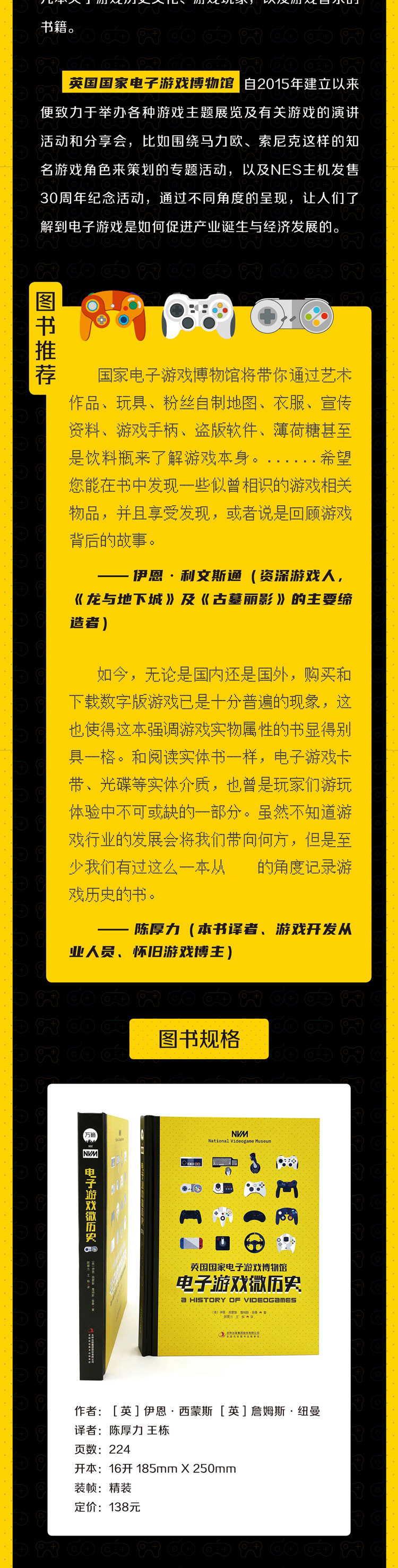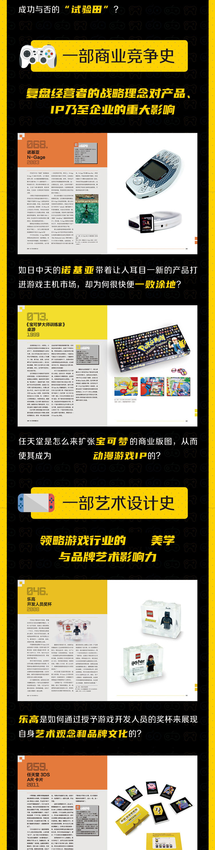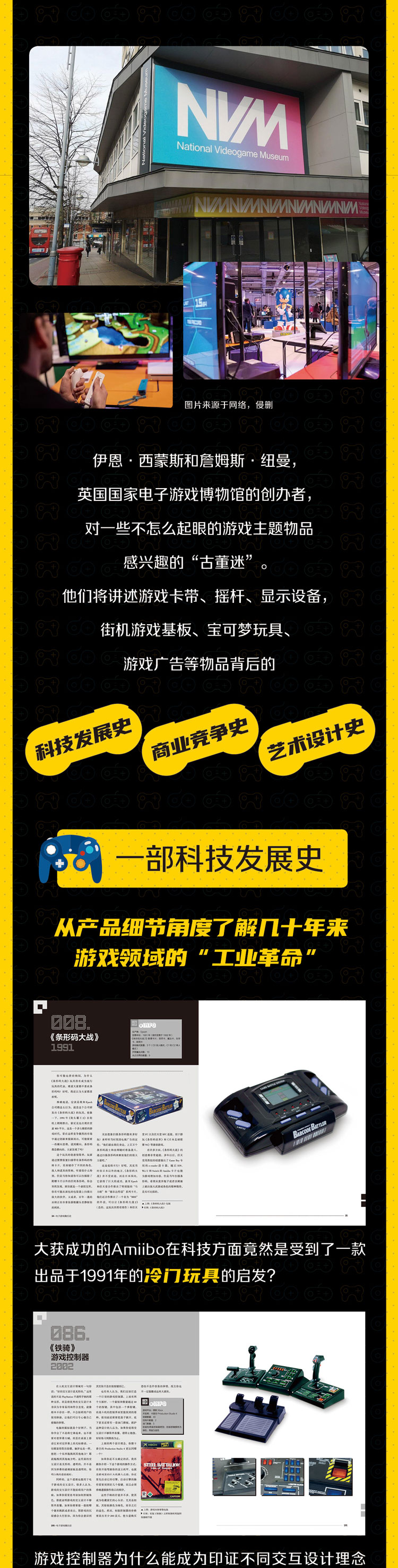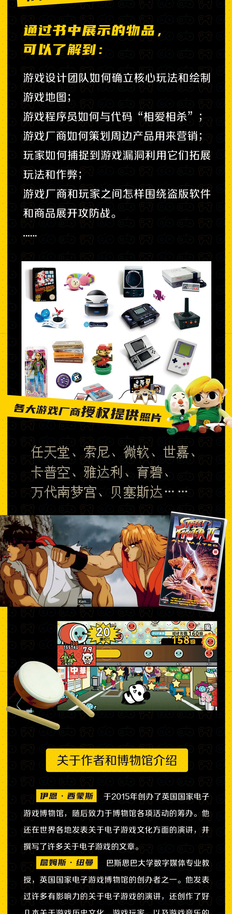 ·英国国家电子游戏博物馆官方授权出品 ·精选 100 件来自世界各地的有代表性的电子游戏产业相关物件,讲述每个物件背后所蕴藏的故事 ·由任天堂、索尼、微软、世嘉、卡普空、雅达利、育碧、万代南梦宫、贝塞斯达等游戏公司授权提供大量珍贵图片资料 大获成功的Amiibo竟然是受到了一款出品于1991年的冷门玩具的启发? 游戏公司负责人及开发团队是怎样违背“常理”,从而使《007:黄金眼》成为电影改编游戏乃至整个游戏领域的经典之作的? 如日中天的诺基亚带着让人耳目一新的产品打进游戏主机市场,却为何很快便一败涂地? 游戏控制器为什么能成为印证不同交互设计理念成功与否的“试验田”? 乐高是如何通过授予游戏开发人员的奖杯来展现自身艺术观念和品牌文化的? ...... 来吧,和英国国家电子游戏博物馆的创办人,一同探秘游戏卡带、摇杆、显示设备、街机游戏基板、宝可梦玩具、游戏广告等物件背后的科技发展史、商业竞争史、艺术设计史!