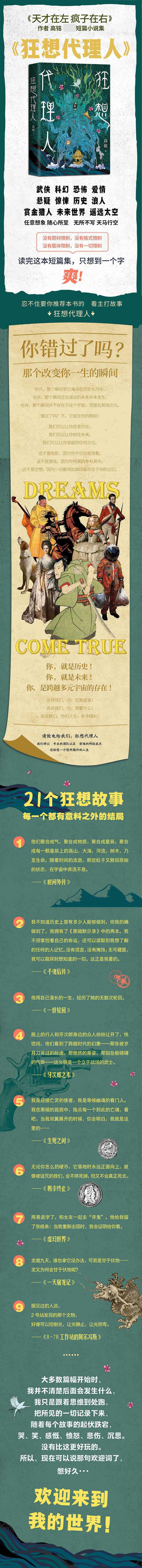 \\\\\\\"《狂想代理人》 大约一年半前,突然冒出来一家名字奇怪的公司,叫“狂想代理人”。这家公司四处打广告。看宣传资料上说,这家公司有心理咨询的性质,还有其他什么关于心理健康、思维体验一类的说辞。最初人们对这家公司并没太多关注,因为这种性质的心理诊所或者公司太多了,虽然也这么铺天盖地地打过很多广告,但大多数都混得不是很好。果然,一个季度后,基本上见不到这家公司的广告了。姚远最开始就对这类事情没什么兴趣,也就没太留意,以为又是一个用新概念圈钱的资本玩法而已。现在钱圈够了,半死不活地慢慢烧投资人的钱。 但没想到的是,最近这半年来那家公司突然火了起来,这回不是广告,而是口碑。很多去过的人都一脸神秘且满足地告诉别人:靠谱!狂想代理人靠谱!但到底怎么靠谱,那些去过的人基本都绝口不提。不过,知道的人越多就越不存在什么秘密,很快,消息传开了,那到底这家打着心理招牌的公司是干什么的呢? 这个叫“狂想代理人”的公司,能够借助心理分析、催眠,还有香薰以及药物使用,让你在半天的时间里体验到你想要的人生——当然,是在某种幻境中,就是所谓的浸入式思维体验。据说无比真实,能让任何人在那个幻境中按照自己想要的方式度过一生。 姚远第一次听到这个消息的时候觉得有点好笑:疯了吧?不就是做白日梦吗?有意思吗?但随着身边越来越多的一些亲历者斩钉截铁的说法,姚远慢慢改变了看法。 “你无法想象那有多真实!”几乎每个去过的人都会这么说,同时脸上带着一缕满足且回味的笑意。这包括姚远的表哥——一个已经过得相当不错的成功商人:“我知足了,这辈子知足了!”跟着又是一声意犹未尽的叹息。 “你……通过那家公司,到底经历了什么?”姚远问。 表哥笑了笑,开始东拉西扯,闪烁其词。 姚远没再追问,但正如餐厅那个小辫子男人说的,“搞得心里痒痒的”。 另外,所有去过的人都承认一点:价格昂贵,非常昂贵!姚远问了表哥,表哥对这个倒没隐瞒,如实说了。就在姚远惊讶的同时,表哥表示:值!这点钱不算啥,真值! 那差不多是姚远十个月的收入总和。 “最初我也觉得太贵了,但现在回想起来,真的值!”姚远的上司也这么说,并且嘴角露出一丝心满意足的笑容。 “我打算每隔四五年就体验一把,等我有了新人生愿望的时候!”表哥充满了期待。 晚上睡前,姚远叼着牙刷看着手机上一个话题论坛,这里讨论的都是关于“狂想代理人”的话题。 …… 跟帖32:刷卡的时候我真是肝儿颤啊!贵,真贵!而且还是基础价,心理测评完才会有实际报价,据说最贵的有可能翻一倍!所以输入付款密码的时候我手都有点抖。不过,等做完后,我觉得收费是合理的! 跟帖41:我觉得这种开始定价和实际收费不符的算是欺诈!应该去告他们! 跟帖45:那位41楼的老乡,人家公司至今可是零投诉零差评零诉讼,而且体验前的合同里有条款:不满意可退全款!当场!再说了,那么多人花了自己的钱都觉得值,您操什么心啊。 跟帖51:这点不怪41,我体验之前也这么想的,我就不信他们没毛病!反正有一点不满意我就要求退款!结果……嘿嘿嘿。 跟帖52:你嘿嘿个啥!倒是说说啊,你实现了什么样的人生啊! 跟帖53:嘿嘿嘿。 跟帖54:嘿嘿嘿,保持队形! 跟帖55:嘿嘿嘿。 跟帖56:别嘿嘿了,这种嘿嘿楼盖出过好几百帖了,水这个有意思吗?我已经交了钱准备体验,这一个月每周都去做心理测评、身体测评、各种分析测试,也不知道都有什么用!虽然说好的人那么多,但我还是觉得……期待我成为第一个不满意退款的吧! 跟帖60:那位56楼的兄弟,等你体验完,也会加入嘿嘿嘿大军的。 跟帖61:所以说,你们去实现的理想中的人生都是嘿嘿嘿吗?(笑哭脸) 跟帖63:真羡慕你们啊,我穷。 跟帖66:学生党同羡慕。 …… 跟帖909:大家好,我就是56楼,我回来了!让大家失望了,我不会有任何退款的念头,因为没任何理由不满意!太爽了!难以想象!真不愧是狂想代理人!服了! 跟帖922:大家都别吵,请问909楼,你是打算跟我们说说你经历了什么,还是打算也加入嘿嘿嘿? 跟帖929:他必须嘿嘿嘿。喵的!你们到底都体验了什么啊?整天都嘿嘿嘿的! 跟帖930:嘿嘿嘿。 跟帖932:嘿嘿嘿。 跟帖933:来了!嘿嘿嘿!保持队形!这是新的嘿嘿嘿大楼! …… 姚远把手机扔到床上,起身去洗手间漱口,吐掉,擦干净,然后躺在床上开始出神:虽然这个昂贵的体验令他很感兴趣,但有个重要的问题:他认真地想了很久,却不知道自己理想中的人生该是什么样。 一星期后。 姚远不安地坐在等候间的小沙发上,目光时不时扫过里面那扇门。 出于好奇,他还是来了。现在正坐在狂想代理人公司的客户接待间。 今天就是预约好的时间,但他来早了,所以需要等候。令他感到意外的是,哪怕只是想当面咨询一下也需要预约。 等候间是一个几乎用纯浅色调布置的小单间,两个米色小沙发,一张白色小圆桌,一扇泛着白光的假窗,没了,就这些。在等候间里,还能听到不知道从哪儿传来的轻音乐声。 幽闭恐惧症的人怎么办?在这种房间里会不会觉得无法呼吸?不安开始让姚远思维发散。 没一会儿,里面那扇小门开了,一个看上去精神饱满神采奕奕的中年人快步向他走来。 他一定喝了很多咖啡,姚远想。 “你好。”他温和地笑着,向姚远伸出手,“我姓谭,是这里的咨询师。” 姚远连忙站起身回应。 落座后,精神饱满的谭姓咨询师打开手里的写字板