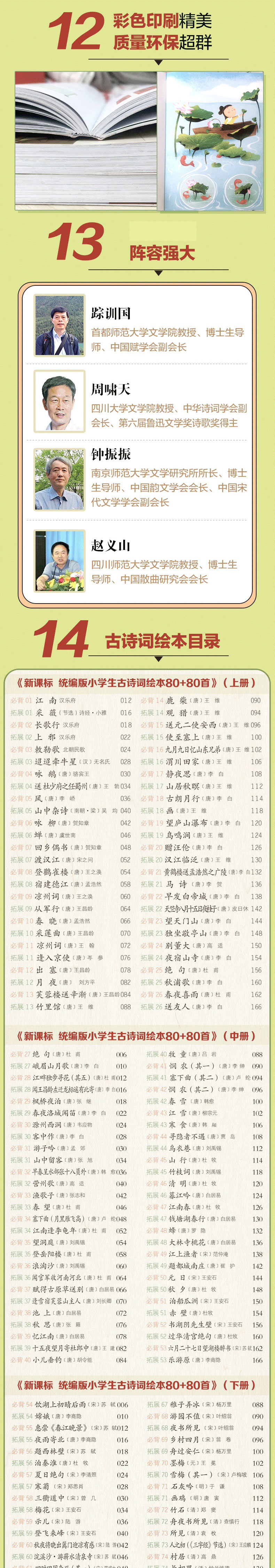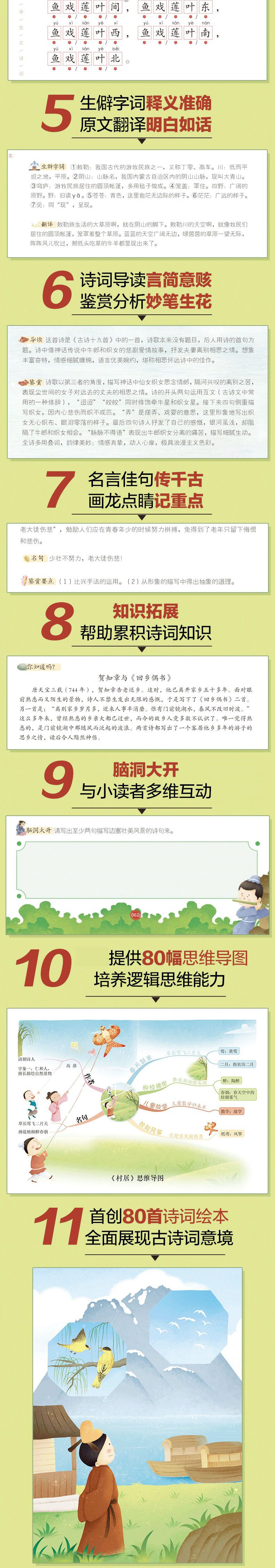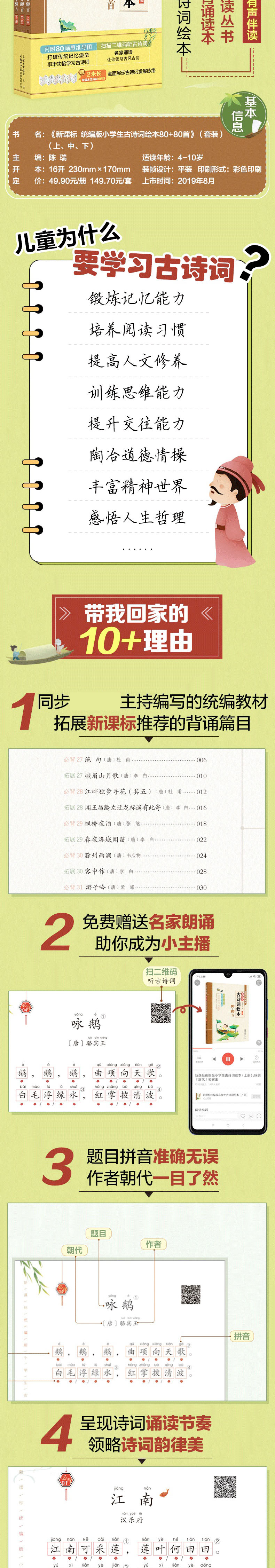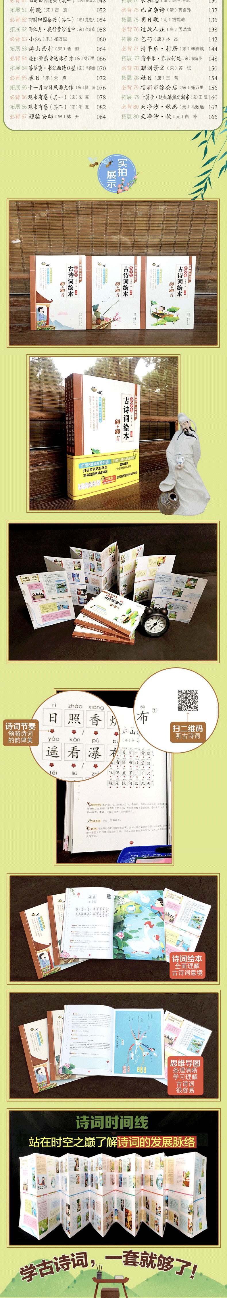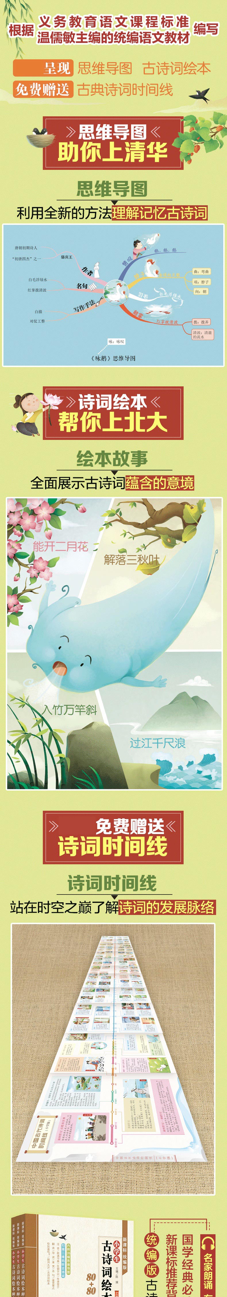 \\\\\\\"《新课标 统编版小学生古诗词绘本80+80首》一共收录了160首古诗词。其中,110首是统编版教材收录(110首为新课标要求必背75首+35首);另外50首是作者根据教学经验编写的拓展。 这套古诗词绘本每首古诗包括了“原文”“注音”“音频二维码”“绘本故事”“你知道吗?”“思维导图”等16个栏目,是目前为止解析全面的小学生古诗词绘本。 \\\\\\\"