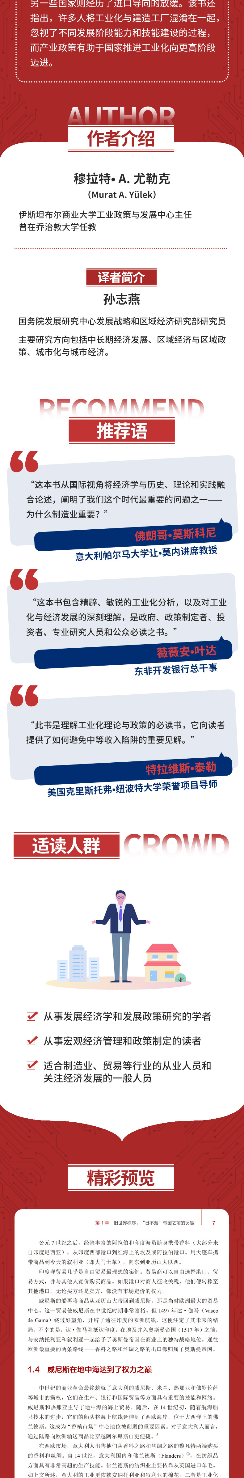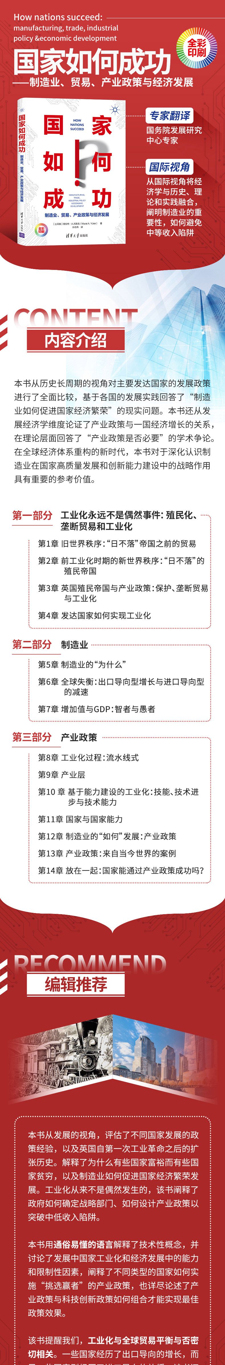 \\\"本书从发展的视角,评估了不同国家发展的政策经验,以及英国自第一次工业革命之后的扩张历史。解释了为什么有些国家富裕而有些国家贫穷,以及制造业如何促进国家经济繁荣发展。工业化从来不是偶然发生的,该书阐释了政府如何确定战略部门、如何设计产业政策以突破中低收入陷阱。 本书用通俗易懂的语言解释了技术性概念,并讨论了发展中国家工业化和经济发展中的能力和限制性因素,阐释了不同类型的国家如何实施“挑选赢者”的产业政策,也详尽论述了产业政策与科技创新政策如何组合才能实现最佳政策效果。 该书提醒我们,工业化与全球贸易平衡与否密切相关。一些国家经历了出口导向的增长,而另一些国家则经历了进口导向的放缓。该书还指出,许多人将工业化与建造工厂混淆在一起,忽视了不同发展阶段能力和技能建设的过程,而产业政策有助于国家推进工业化向更高阶段迈进。\\\"