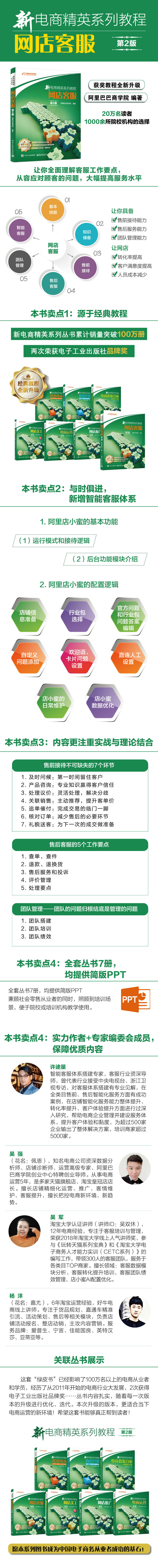1.这套“绿皮书”已经影响了100万名以上的电商从业者和学员,经历了从2011年开始的电商行业大发展,2次获得电子工业出版社最佳品牌奖……丛书内容扎实,随着每一次版本的升级进行优化、迭代。 2.2019年升级的版本,知识体系更契合前沿,增加了智能客服相关内容,更适合现阶段电商客服的特点。 3. 产教融合更加突出。丛书邀请在实操层面有丰富经验的电商企业家和创业者作为写作团队,同时邀请来自教育部高等学校电子商务类专业教学指导委员会的专家、高等院校的一线教师参与到图书内容的创作与完善当中,既保证了图书内容的切实指导性和可操作性,也保证了图书内容的逻辑性和条理性。 4.学习使用更加便利。编写团队在创作初期便充分考虑如何让升级版教材既适合市场零售读者阅读,又能够更广泛地应用到高等院校中。因此,本套丛书根据对高校学生培养的特点做了相关设计,如在大部分章节安排有练习题,每本书都配有PPT课件等。 5.本书是“新电商精英系列教程”升级版中的一本,全套丛书包括: 《电商运营(第2版)》ISBN 978-7-121-36618-5 《网店客服(第2版)》ISBN 978-7-121-36633-8 《网店美工(第2版)》ISBN 978-7-121-36616-1 《电商数据分析与数据化营销》ISBN 978-7-121-36613-0 《网店推广(第2版)》ISBN 978-7-121-36617-8 《跨境电商运营实务:跨境营销、物流与多平台实践》ISBN 978-7-121-36615-4 《内容营销:图文、短视频与直播运营》ISBN 978-7-121-36614-7