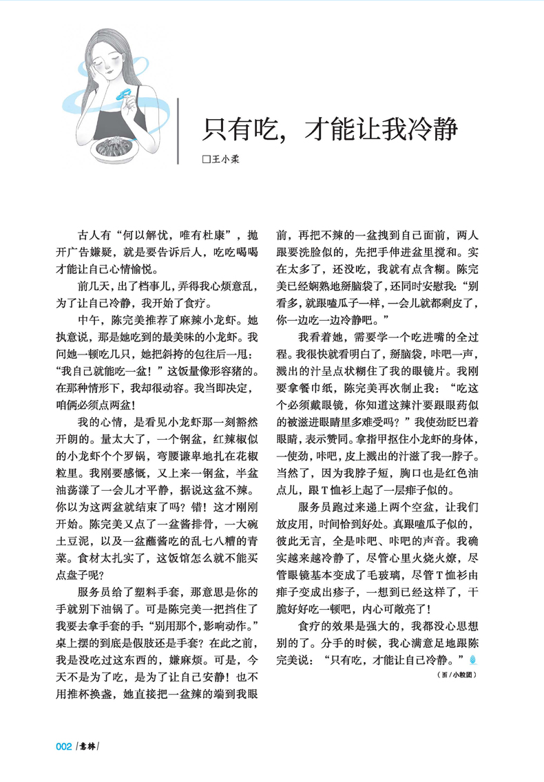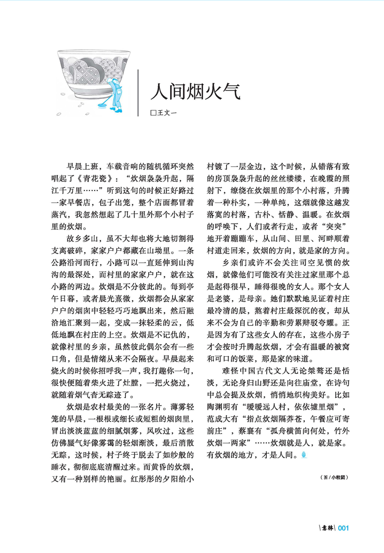 人间烟火气 早晨上班,车载音响 的随机循环突然唱起了《 青花瓷》:“炊烟袅袅升 起,隔江千万里……”听到 这句的时候正好路过一家 早餐店,包子出笼,整个 店面都冒着蒸汽,我忽然 想起了几十里外那个小村 子里的炊烟。 故乡多山,虽不大却 也将大地切割得支离破碎 ,家家户户都藏在山坳里 。一条公路沿河而行,小 路可以一直延伸到山沟沟 的最深处,而村里的家家 户户,就在这小路的两边 。炊烟是不分彼此的。每 到亭午日暮,或者晨光熹 微,炊烟都会从家家户户 的烟囱中轻轻巧巧地飘出 来,然后融洽地汇聚到一 起,变成一抹轻柔的云, 低低地飘在村庄的上空。 炊烟是不记仇的,就像村 里的乡亲,虽然彼此偶尔 会有一些口角,但是情绪 从来不会隔夜。早晨起来 烧火的时候你招呼我一声 ,我打趣你一句,很快便 随着柴火进了灶膛,一把 火烧过,就随着烟气杳无 踪迹了。 炊烟是农村最美的一 张名片。薄雾轻笼的早晨 ,一根根或细长或短粗的 烟囱里。冒出淡淡蓝蓝的 细腻烟雾,风吹过,这些 仿佛蜃气好像雾霭的轻烟 渐淡,最后消散无踪,这 时候,村子终于脱去了如 纱般的睡衣,彻彻底底清 醒过来。而黄昏的炊烟, 又有一种别样的艳丽。红 彤彤的夕阳给小村镀了一 层金边,这个时候,从错 落有致的房顶袅袅升起的 丝丝缕缕,在晚霞的照射 下,缭绕在炊烟里的那个 小村落,升腾着一种朴实 ,一种单纯,这烟就像这 越发落寞的村落,古朴、 恬静、温暖。在炊烟的呼 唤下,人们或者行走,或 者“突突”地开着蹦蹦车, 从山间、田里、河畔顺着 村道走回来,炊烟的方向 ,就是家的方向。 乡亲们或许不会关注 司空见惯的炊烟,就像他 们可能没有关注过家里那 个总是起得很早,睡得很 晚的女人。那个女人是老 婆,是母亲。她们默默地 见证着村庄最冷清的晨, 熬着村庄最深沉的夜,却 从来不会为自己的辛勤和 劳累辩驳夸耀。正是因为 有了这些女人的存在,这 些小房子才会按时升腾起 炊烟,才会有温暖的被窝 和可口的饭菜,那是家的 味道。 难怪中国古代文人无 论桀骜还是恬淡,无论身 归山野还是向往庙堂,在 诗句中总会提及炊烟,悄 悄地织构美好。比如陶渊 明有“暖暧远人村,依依 墟里烟”,范成大有“指点 炊烟隔莽苍,午餐应可寄 前庄”,蔡襄有“孤舟横笛 向何处,竹外炊烟一两家 ”……炊烟就是人,就是家 。有炊烟的地方,才是人 间。 只有吃,才能让我冷 静 古人有“何以解忧,唯 有杜康”,抛开广告嫌疑 ,就是要告诉后人,吃吃 喝喝才能让自己心情愉悦 。 前几天,出了档事儿 ,弄得我心烦意乱,为了 让自己冷静,我开始了食 疗。 中午,陈完美推荐了 麻辣小龙虾。她执意说, 那是她吃到的最美味的小 龙虾。我问她一顿吃几只 ,她把斜挎的包往后一甩 :“我自己就能吃一盆!” 这饭量像形容猪的。在那 种情形下,我却很动容。 我当即决定,咱俩必须点 两盆! 我的心情,是看见小 龙虾那一刻豁然开朗的。 量太大了,一个钢盆,红 辣椒似的小龙虾个个罗锅 ,弯腰谦卑地扎在花椒粒 里。我刚要感慨,又上来 一钢盆,半盆油荡漾了一 会儿才平静,据说这盆不 辣。你以为这两盆就结束 了吗?错!这才刚刚开始 。陈完美又点了一盆酱排 骨,一大碗土豆泥,以及 一盆蘸酱吃的乱七八糟的 青菜。食材太扎实了,这 饭馆怎么就不能买点盘子 呢? 服务员给了塑料手套 ,那意思是你的手就别下 油锅了。可是陈完美一把 挡住了我要去拿手套的手 “别用那个,影响动作。” 桌上摆的到底是假肢还是 手套?在此之前,我是没 吃过这东西的,嫌麻烦。 可是,今天不是为了吃, 是为了让自己安静!也不 用推杯换盏,她直接把一 盆辣的端到我眼前,再把 不辣的一盆拽到自己面前 ,两人跟要洗脸似的,先 把手伸进盆里搅和。实在 太多了,还没吃,我就有 点含糊。陈完美已经娴熟 地掰脑袋了,还同时安慰 我:“别看多,就跟嗑瓜 子一样,一会儿就都剩皮 了,你一边吃一边冷静吧 。” 我看着她,需要学一 个吃进嘴的全过程。我很 快就看明白了,掰脑袋, 咔吧一声,溅出的汁呈点 状糊住了我的眼镜片。我 刚要拿餐巾纸,陈完美再 次制止我:“吃这个必须 戴眼镜,你知道这辣汁要 跟眼药似的被滋进眼睛里 多难受吗?”我使劲眨巴 着眼睛,表示赞同。拿指 甲抠住小龙虾的身体,一 使劲,咔吧,皮上溅出的 汁滋了我一脖子。当然了 ,因为我脖子短,胸口也 是红色油点儿,跟T恤衫 上起了一层痱子似的。 服务员跑过来递上两 个空盆,让我们放皮用, 时间恰到好处。真跟嗑瓜 子似的,彼此无言,全是 咔吧、咔吧的声音。我确 实越来越冷静了,尽管心 里火烧火燎,尽管眼镜基 本变成了毛玻璃,尽管T 恤衫由痱子变成出疹子, 一想到已经这样了,干脆 好好吃一顿吧,内心可敞 亮了! 食疗的效果是强大的 ,我都没心思想别的了。 分手的时候,我心满意足 地跟陈完美说:“只有吃 ,才能让自己冷静。” P1-2