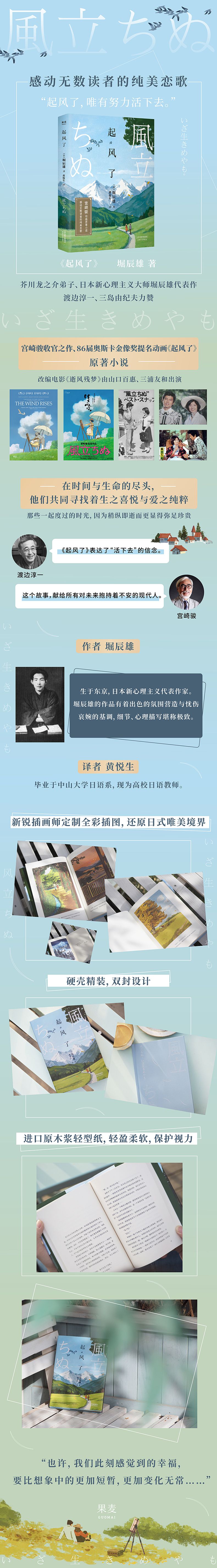在那些夏日里,每当你站在芒草丛生的原野上专心地画画时,我总是躺在旁边一棵白桦树的树荫里。到傍晚时,你收工了,来到我的身边。我们把手搭在彼此的肩上,眺望着远处的地平线——原本已经暮色渐沉的地平线,被一大片暗红色边缘的、厚厚的积雨云覆盖着,仿佛正孕育着什么...... 在这样一个将近初秋的午后,你把尚未完成的画作搁在画架上,和我并排躺在那棵白桦树的树荫里,啃着水果。像细沙一般的浮云在空中缓缓流动。这时,不知从哪 里突然吹来一阵风。我们头顶上,从枝叶间露出的蓝色天空被吹得忽大忽小。几乎与此同时,草丛中传来物体倒地的“啪嗒”声响——好像是我们搁在那边的画连同画架一 起倒了下去。你正要起身去看,我却像害怕这一瞬间会失去什么似的,硬是把你拉住了,不让你离开我身边。你也就任由我拉着,没有走开。 “起风了,唯有努力活下去。” 你偎依着我,我把手搭在你肩上,嘴里反复念叨着这脱口而出的诗句。过了一会儿,你终于挣脱我的手,起身走开了。还没干透的画布上沾满了草叶。你把它放回画架上,一边用调色刀费力地刮掉草叶,一边说道: “唉!要是被父亲看见的话......”你回头望着我,露出了含蓄的微笑。 “再过两三天,父亲就要来啦。” 一天清晨,我们正在林间漫步时,你忽然开口了。我沉默不语,觉得颇为扫兴。你一边看着我,一边用略带沙 哑的声音继续说道: “到时,我们就不能像这样一起散步了吧?” “怎样散步都行呀,只要愿意的话。” 我仍然闷闷不乐。尽管分明感觉到了你的目光里带有几分忧虑,我却装作被头顶沙沙作响的树梢吸引了注意力。 “父亲老是不让我离开他身边。” 我终于按捺不住,用焦躁的目光与你对视: “你是说,我们现在就分手吗?” “那有什么办法呢!” 说完,你仿佛早已死心似的,努力地向我挤出一丝笑容。可是,你当时的脸色,还有你的嘴唇,是多么苍 白啊! “为什么会突然变成这样呢?你不是已经把一切都交付给我了吗......” 我流露出了不耐烦的神情。狭窄的山路上,随处可 见裸露的树根。我让你走在前面,自己则步履艰难地跟在后头。 这一带的树丛显得更加茂密,空气凉飕飕的,到处都是小溪谷。突然,我脑中闪过一个念头:我俩今年夏天才刚认识,你就对我如此顺从。那么,你对你的父亲,对包括你父亲在内的任意支配着你的人,岂不是更加百依百顺?...... “节子,如果你真是这样的话,我会更喜欢你呢。等我的生活安定下来,就一定会去迎娶你的。在那之前,暂时像现在这样待在你父亲身边也好......” 我自言自语地说着,随即又突然拉住你的手,仿佛在征求你的同意。你任由我拉着手。我们就这样手拉着手, 站在一片溪谷前面。这片小溪谷在我们脚边深深地往下陷。阳光好不容易才透过无数枝丫交错的灌木丛,斑驳地洒落在谷底的凤尾草上。这些细碎的阳光在穿行途中,随着若有若无的微风轻轻摇曳,时隐时现。我们沉默不语,悲伤地凝望着眼前的景象。 两三天后的某日傍晚,我在餐厅看到你和前来接你的父亲一起吃晚餐。你背对着我的姿态显得很不自然。你此刻的神态和举止,想必是因为父亲在旁边而下意识地流露出来的,却让我觉得你仿佛变成了一个陌生的小姑娘。 “我就算喊她的名字......”我喃喃自语,“她也不会回头看我一眼吧。就好像我不是在喊她一样......” 当天晚上,我百无聊赖,独自一人出去散步回来,又在寂静无人的旅馆后院徘徊了很久。山百合散发着芬芳。 我茫然地望着旅馆里还透出灯光的两三扇窗口。不久,似有薄雾笼罩下来。窗里的灯光仿佛对这薄雾感到畏惧似的,一盏接一盏地熄灭了。整栋旅馆陷入一片漆黑。就在这时,传来“嘎吱”一声轻响,一扇窗慢慢地打开了。 一个穿着玫瑰色睡衣的少女静静地倚靠在窗边——那就是你...... 芥川龙之介弟子、日本新心理主义大师堀辰雄代表作,感动无数读者的纯美恋歌 宫崎骏动画收官之作《起风了》、山口百惠主演电影《逝风残梦》原著小说 那些一起度过的时光,因为稍纵即逝而更加弥足珍贵 “也许,我们此刻感觉到的幸福,要比想象中的更加短暂、更加变化无常。” 新锐插画师定制全彩插图,还原日式唯美境界