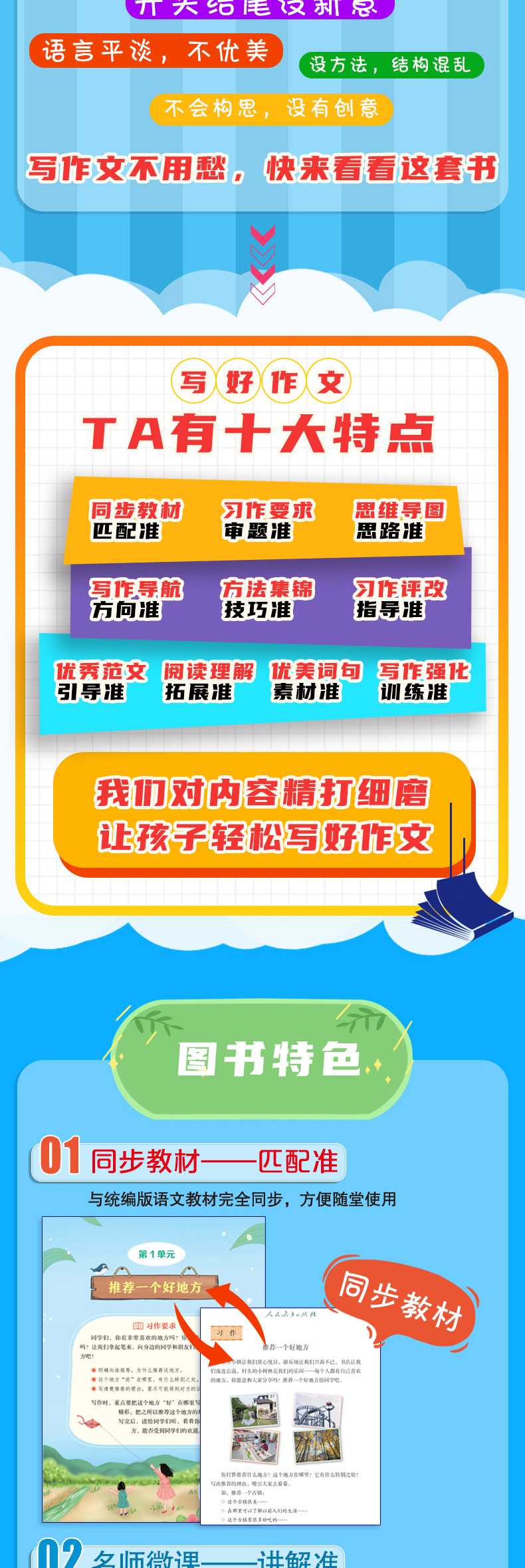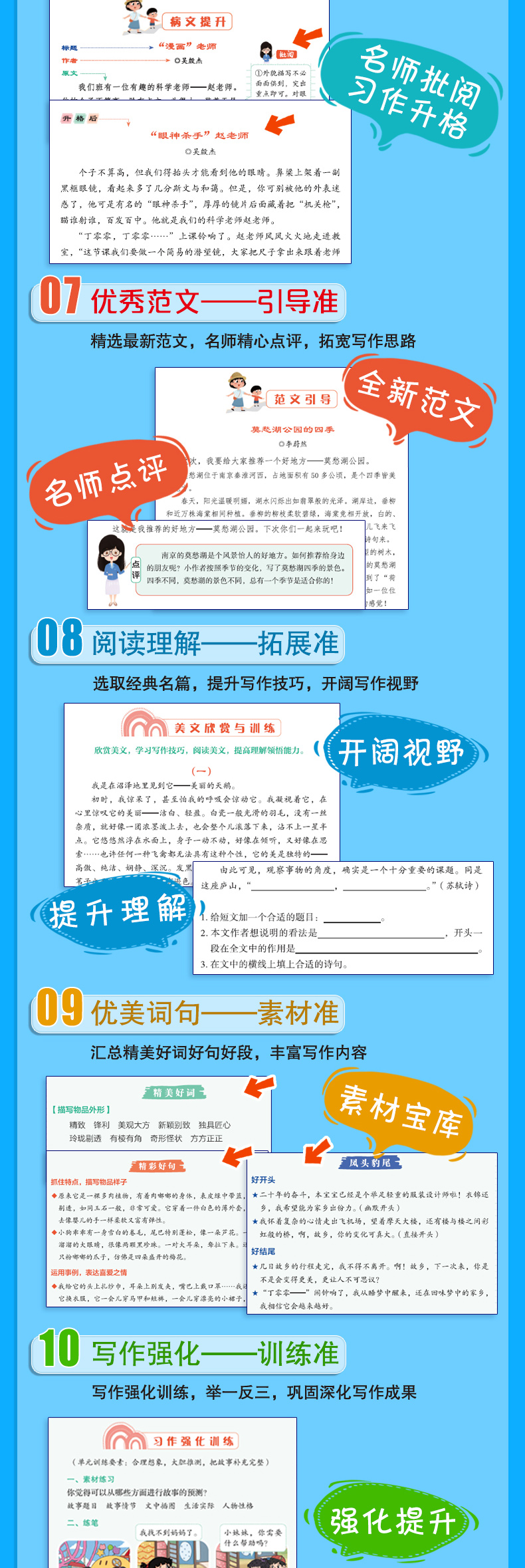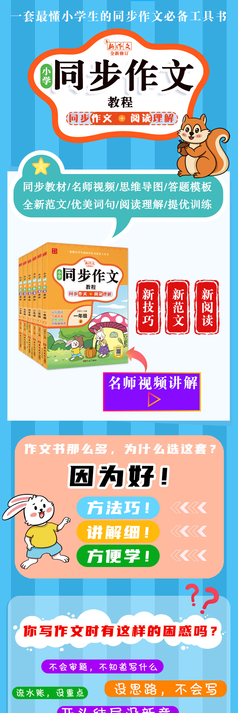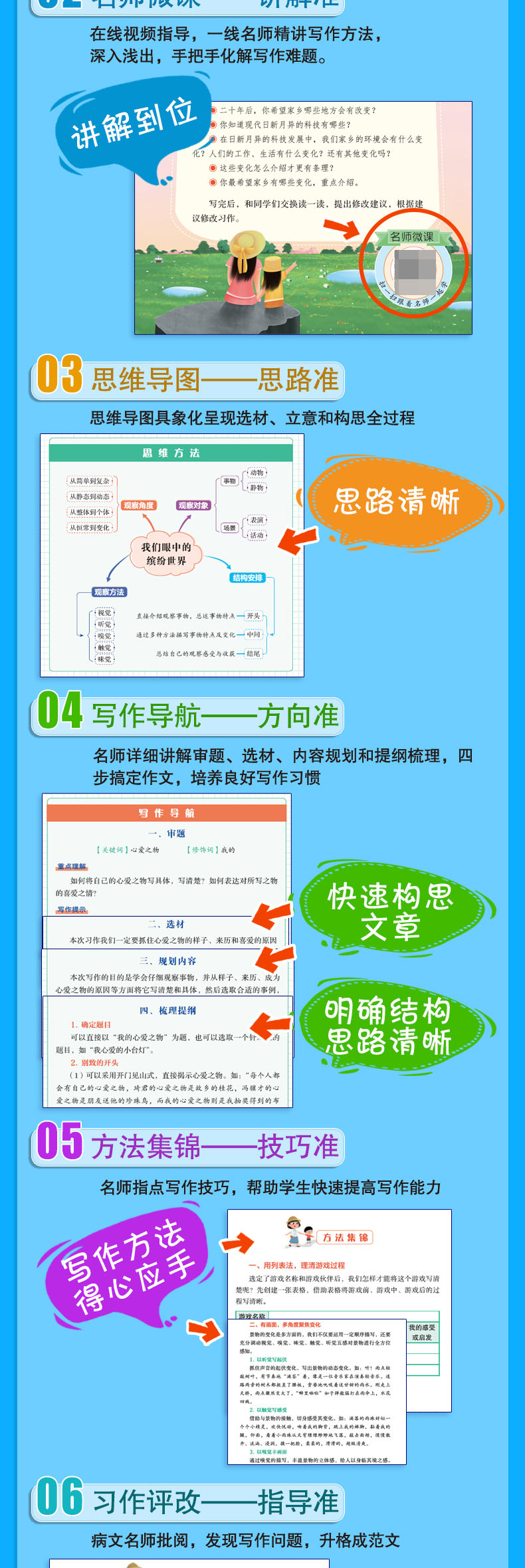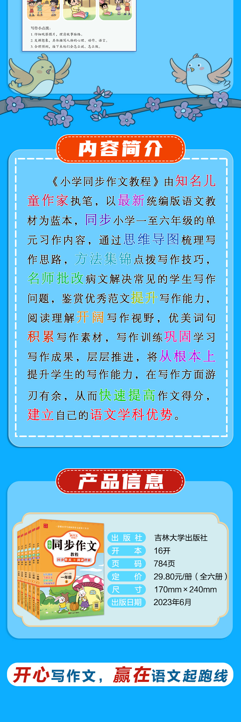 《小学同步作文教程》由知名儿童作家执笔,以最新统编版语文教材为蓝本,同步小学一至六年级的单元习作内容,通过思维导图梳理写作思路,方法集锦点拨写作技巧,名师批改病文解决常见的学生写作问题,鉴赏优秀范文提升写作能力,阅读理解开阔写作视野,优美词句积累写作素材,写作训练巩固学习写作成果,层层推进,将从根本上提升学生的写作能力,在写作方面游刃有余,从而快速提高作文得分建立自己的语文学科优势