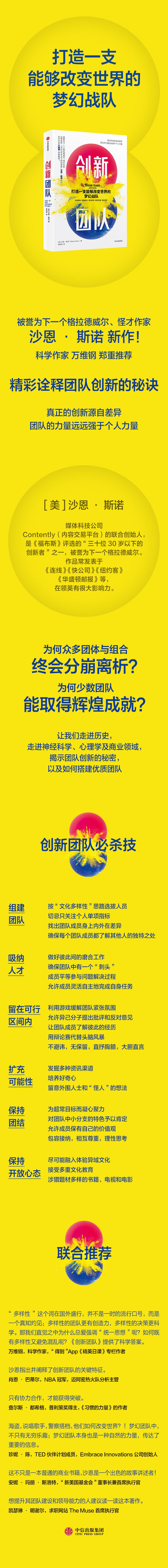推荐序 在我上小学三四年级的时候,祖父总爱问我:“今天你打算干些什么来改造这个世界?”每天早晨,只要一见面,我就知道他会这么问。 那是20 世纪六七十年代,我住在马萨诸塞州波士顿的罗克斯伯里—一个治安混乱的街区。在这里,一个黑人孩子要想无忧无虑地成长并不是件容易的事。 每回一见面,祖父就会重复这个相同的问题。 他不是问:“今天你打算干些什么来让你的生活变得更好?” 他是在问:“今天你打算干些什么来让这个世界变得更好?” 坦白地说,当时我只有一个想法:“改造世界是我的职责”。 回望来路,我清楚地意识到,在实现伟大梦想的过程中,一个人的力量是远远不够的。我的成长经历使我始终渴望着以领头羊的身份去干成一件事情,但我也深知,仅凭一己之力难以完成大业。 这一信念因而也成了我在处理各种问题时一贯秉持的原则。 比如,在创办公司时,我和搭档科里冒出了一个大胆的想法:“假如要打造一个全世界最有趣的公司,我们该怎么做?” 坐下来勾画蓝图时,我们首先考虑的,并不是这家公司该选择哪些群体作为目标客户,或是该采取哪些创新举措。尽管那些都是成立公司时需要考虑的常规问题。 我们想的是:“什么样的团队能够让这个蓝图变为现实?” 我们认为,只要能将适合的各路人才招至麾下,只要能让他们的独特观点为我们所用,我们的目标就一定能达成。 在我们看来,拥有一个成员背景各异的团队,意味着我们能经常得到效果更好、创意更新的点子。这里所说的背景各异,不仅指他们的文化背景,还指他们的专业背景。有研究表明,当来自不同文化、不同专业的人组成一个集体时,他们更容易成功,因为他们会尽最大努力来让其他人理解自己的想法。与不同于自己的人共事时,为了说服对方相信某种做法是对的、某种做法是错的,我们需要整合更多的资源和想法,这个过程有助于我们取得突破。 在多年的实际工作中,我们对上述理念奉行不悖。截至目前,我们确已打造出了独一无二的团队,也确已做成了一些堪称全世界最有趣的事情,在壮大企业的同时,也在推动着社会事务的发展。让我们在“超级碗”(美国职业橄榄球联盟年度冠军赛)赛事中一举拿下广告代理权的,并不仅仅是我们的创意。在用影像记录拉美裔人引以为傲的作品和文化遗产时,影像所产生的病毒式传播效果也并不仅仅源于创意本身。成就这一切的,是我们这个团队合作方式。唯有通过采纳并整合团队成员的精彩观点,我们才得以将绝妙的创意付诸实践。 所以说,真正的创新源自差异。当想法各异的我们彼此质疑时,创意会越发精彩。 但有一个问题。 这个过程并不令人舒服,相反,它是一团乱麻—就像波洛克的抽象画。作为普通人,我们都希望能远离冲突,但冲突所致的紧张感会让我们精益求精,只不过,要利用它来提高工作成效却很难。 正因如此,这本书才让我倍感振奋。 我深信,团队的力量要远远强于个人的力量。假如你回想一下历史上曾有过的伟大革新,你会发现它们都得益于团队的合作,都得益于这样一种叩问:“我们能做些什么,才能让他人的生活变得更好?” 我认为一切理应如此—这个想法是不是有些天真?每个人都在努力向着自己人生的顶峰奋进。到达这一个顶峰后,又会走向下一个顶峰。每一段征程,我们都需要同行者。 面对我祖父的问题,不同的人会在不同的时代给出不同的答案。 但是,我们需要携手并进,这一点始终不会变。 所以说,胜利,理当是一群人的狂欢。 为何众多团体与组合终会分崩离析?为何少数团队能取得辉煌成就? 作者沙恩·斯诺将带领读者走进历史,走进神经科学、心理学、以及商业领域,向大家揭示团队创新的秘密。