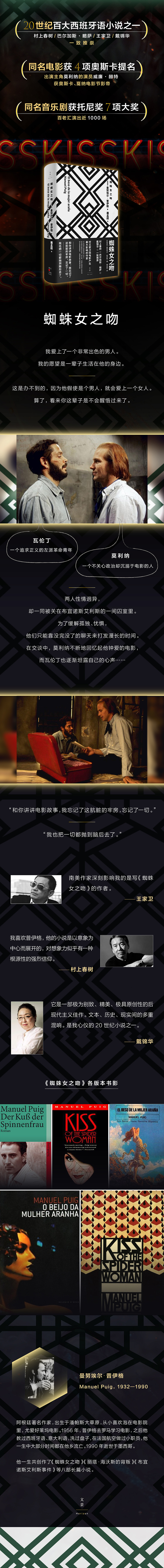 曼努埃尔?普伊格(Manuel Puig,1932—1990) 阿根廷著名作家,出生于潘帕斯大草原上的比耶加斯将军镇,一个他自称“什么都没有的地方”,因而他从小便喜欢泡在电影院里,尤爱好莱坞电影。1956年,普伊格去罗马学习电影,之后他教过西班牙语、意大利语,洗过盘子,在法国航空做过小职员,他一生中大部分时间都在他乡流亡。1990年逝世于墨西哥。 普伊格经常说:“不是我选择了文学,而是文学选择了我。”他本想成为一名导演,或者电影编剧,但均以失败告终,于是逐渐转向文学写作。他一生共创作了《蜘蛛女之吻》《丽塔?海沃斯的背叛》《布宜诺斯艾利斯事件》等八部长篇小说。《蜘蛛女之吻》是普伊格为知名的小说,同名电影获得四项奥斯卡提名,出演主角莫利纳的美国演员威廉·赫特收获了奥斯卡男演员及戛纳电影节男演员奖。