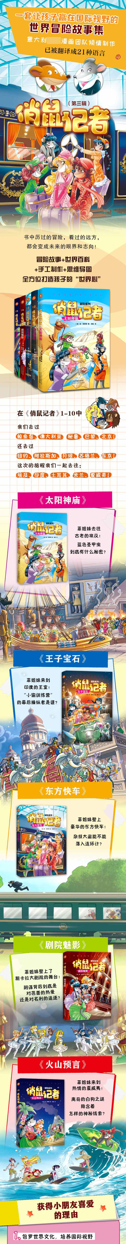****** ※ 经典故事书《老鼠记者》团队倾力打造,《老鼠记者》姐妹篇。 ※ 主要针对6-12岁小读者,通过杰罗尼摩妹妹——菲的视角,记叙了五名活泼可爱的老鼠女孩儿充满传奇色彩的冒险成长故事。 ※ 截止到2017年,《俏鼠记者》已经被翻译成21种语言,**总销量已经超过2100万册,获得多个**小读者的认可和喜爱。 ※ 全新的写作手法,新奇的阅读感受,儿童化、游戏化的语言,成功架起了孩子与父母沟通的桥梁。 ※ 本书语言生动有趣,内容积极向上,通过书中五姐妹的探险经历,可以带领小读者天马行空地周游世界,体会各地风土人情,学到许多有益的文化知识。 ※ 书中配有多幅精美绚丽的插图,文字也不再是呆板无趣地排列在那里,一些特别的字都用不同颜色、不同字体标出,像图画一样色泽丰富、神采飞扬,充满了童趣。
