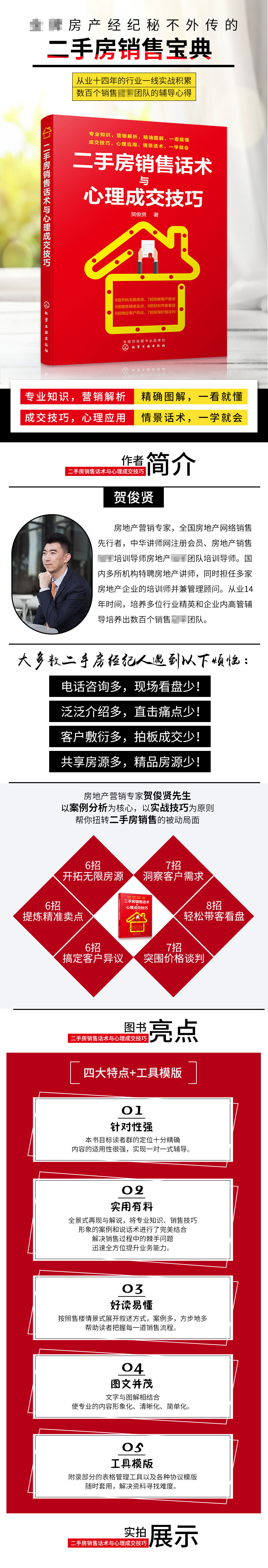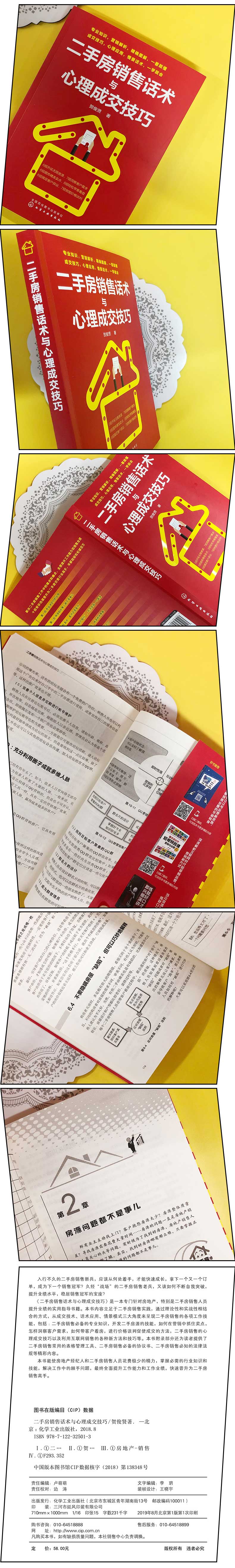 本书通过对房地产销售全景式再现与解说,将专业知识、销售技巧、形象的案例和说话话术进行了**结合,按照售楼情景展开叙述,将理论与实战进行**结合,能够帮助售楼员、房地产经纪人、二手房销售人员***提升业务能力,切实帮助读者解决新房、期房和二手房销售过程中遇到的各种棘手问题,并且分享了很多很好的应对方案,是二手房销售员、售楼员和房地产经纪人提升业务能力,实现快速成交,快速成长为房地产销售和营销人员的**经管书籍。 ★全面介绍建筑设计与规划、建筑面积、产权证登记与变*、买房贷款*作流程、二手房公积金申请、二手房物业交割等专业知识; ★开发房源、说服业主的方法和技巧; ★挖掘二手房的卖点,抓住卖点,提炼卖点,利用卖点进行销售; ★与客户沟通的话术与技巧; ★洞察并挖掘客户需求,达成房源快速成交; ★全面解读带客户看楼盘的技巧,准确把握6种促进成交的时机,促成成交; ★分享了排除客户6种异议的详细方法和技巧,让业绩继续飙升; ★价格谈判法,用价格赢得客户的具体方法; ★新房、期房和二手房实现快速成交的心理学技巧和方法; ★房地产营销和销售的互联网方法和技巧。