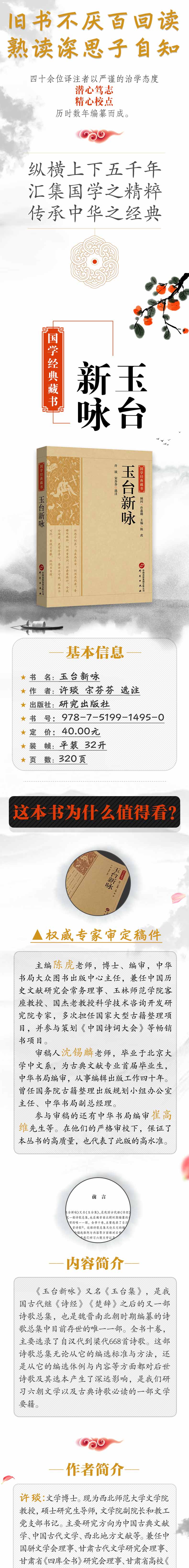 国学经典藏书-玉台新咏 出版时间 2024-01-01T00:00 其他类别 11835 作者: 许琰 宋芬芬 选注 出版社: 研究 原售价: 40.00 折扣价: 21.20 折扣购买: 国学经典藏书-玉台新咏 ISBN: 9787519914950 作者简介 内容简介 上一篇:酒店商务英语(第2版普通高等学校旅游管理教材)下一篇:2022上海高中自主招生—全真模拟卷·数学