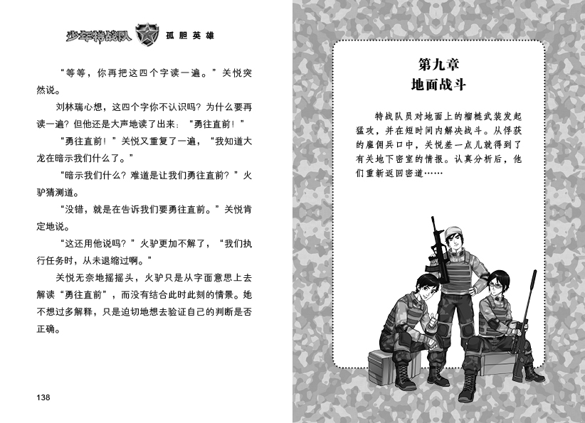 “少年特战队”系列是“特种兵学校”的前传,讲述了五名个性少年——谋略高手张小福、格斗高手火驴、“百科词典”硬盘、神枪手大龙、重量与食量担当的柱子,在少年军校经过魔鬼训练后,成长为内心强大、无坚不摧的“钢铁战士”的故事。 第六季边境作战系列,主要讲述了少年特战队的队员们经过多年的历练与实战,已经成长为军中精英,在各种演习和军事行动中,担负着重要的作战任务。从草原特训到装甲大战,他们是孤胆英雄,更是协同作战的精兵。面对敌人的不宣而战,他们与战友们并肩作战,击退了敌人一次又一次的进攻,就像钢铁长城那样,守护着祖国的边境线。 1.著名少儿军事作家八路成名作,“特种兵学校”前传系列。 2.“阳刚少年”励志主题读物,军事科普读本。 3.个性少年成长为超级英雄的励志故事,对培养孩子的独立性、自信心、责任感、抗压性十分有益。 4.人物鲜明生动,语言风趣幽默,情节连贯紧凑,故事一气呵成,让人欲罢不能。 5.环保印刷,字号行距科学合理,保护孩子视力。