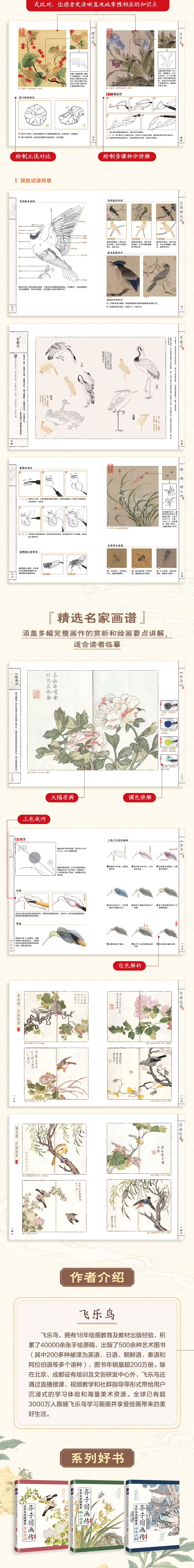 ★随书附赠6节配套视频课程,长达5小时高清视频教学,由浅入深、细致讲解。 ★提取《芥子园画传》中总结的中国画传统技法,通过白话文翻译讲解和临摹示范等形式,分卷讲解剖析草、虫、花、鸟这类花鸟画元素的绘画程式和套路。 ★创新性地使用大量结构示意图与古画结合,十分适合初学者学习;书中精选大量名家作品,与《芥子园画传》中的绘画定式比对,让读者更清晰直观地掌握相应的知识点。