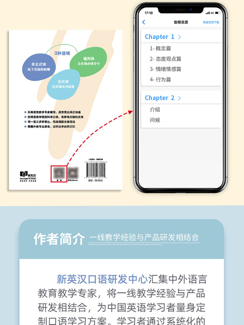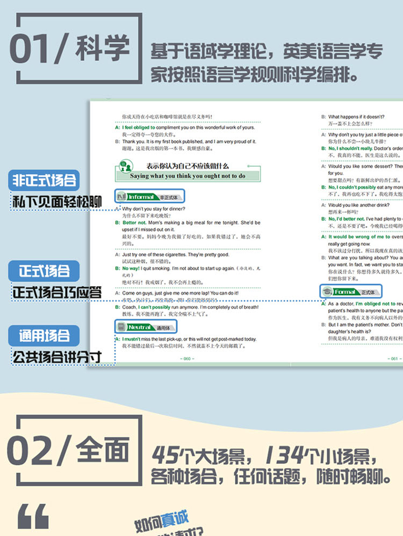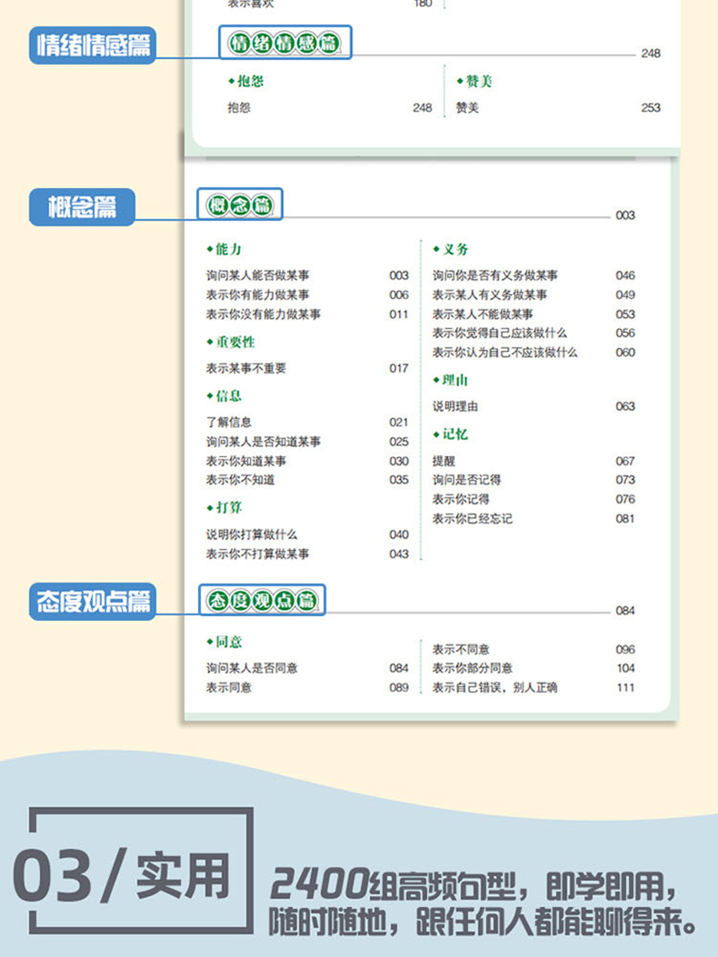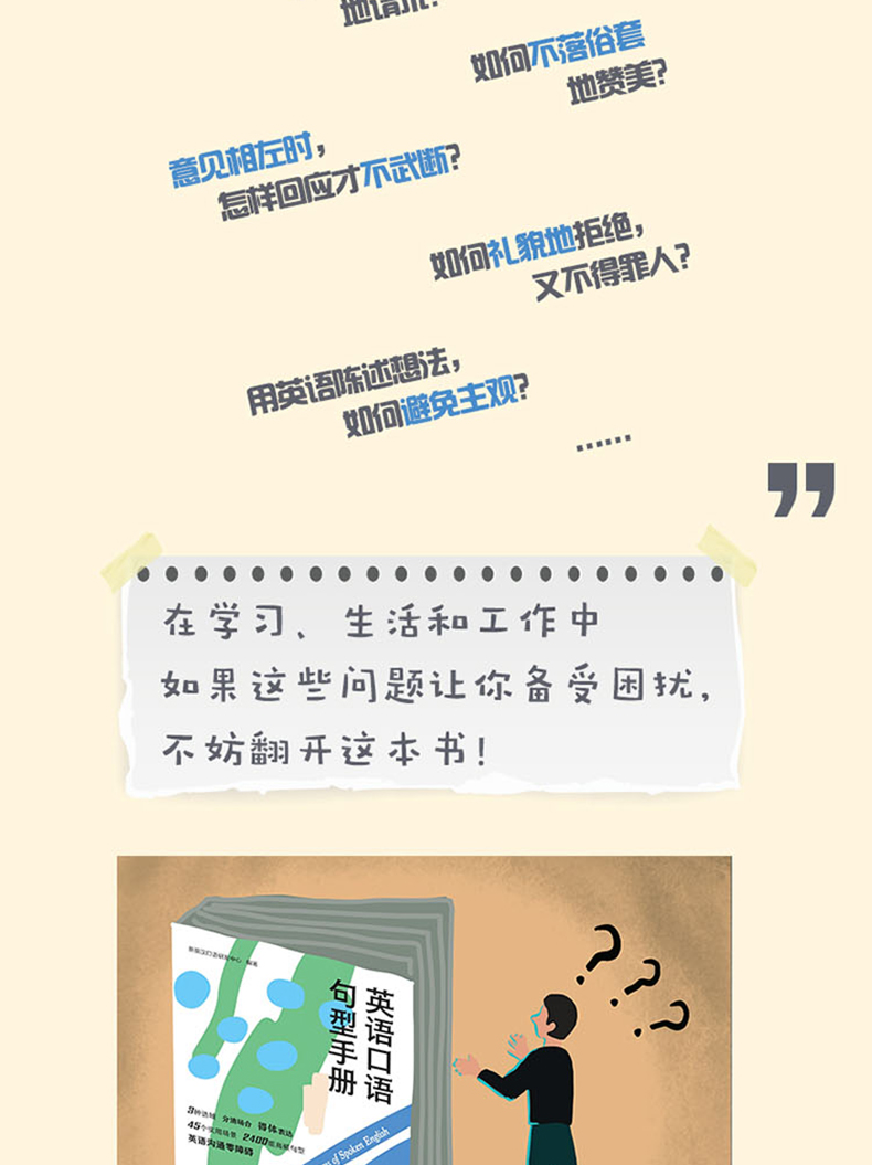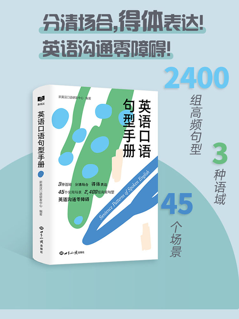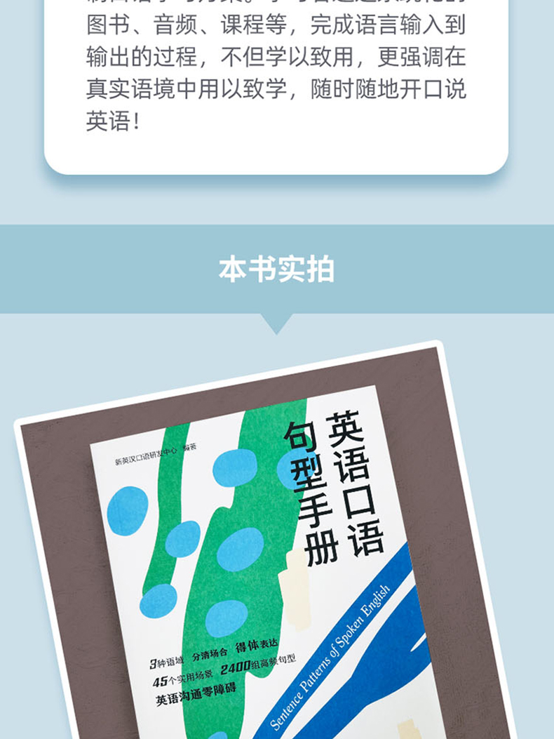 英语口语句型手册 出版时间 2023-01-01T00:00 生活实用英语 68040 作者: 新英汉口语研发中心 出版社: 世界知识 原售价: 69.00 折扣价: 45.60 折扣购买: 英语口语句型手册 ISBN: 9787501266005 作者简介 新英汉口语研发中心汇集中外语言教育教学专家,将一线教学经验与产品研发相结合,为中国英语学习者量身定制口语学习方案。学习者通过系统化的图书、音频、课程等,完成语言输入到输出的过程,不但学以致用,更强调在真实语境中 用以致学,随时随地开口说英语! 内容简介 3种语域 分清场合 得体表达 45个实用场景 2400组高频句型 英语沟通零障碍 上一篇:图解英语音标自然拼读一学就会(从零开始学英语发音)下一篇:中国人最易读错的常用字