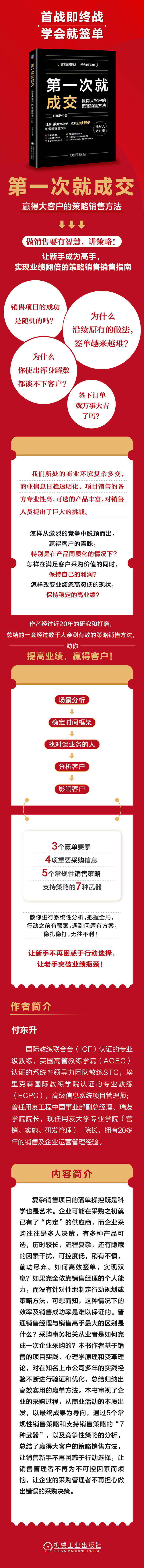 适读人群:销售从业人员,采购从业人员,对销售感兴趣的读者。1. 让买卖双方实现双赢的方法,助力销售人员赢得订单、赢得客户,实现业绩指数级增长。2. 经过实践证明的一套系统高效的策略销售方法。该方法以策略为核心,以心理学相关理论为基础,结合变革理论和我国当下的具体环境,对近1000个实战案例进行萃取、验证和迭代,数千位学员亲身验证。3.作者在名上市公司从事销售工作和研究近20年,积累深厚,成果斐然。