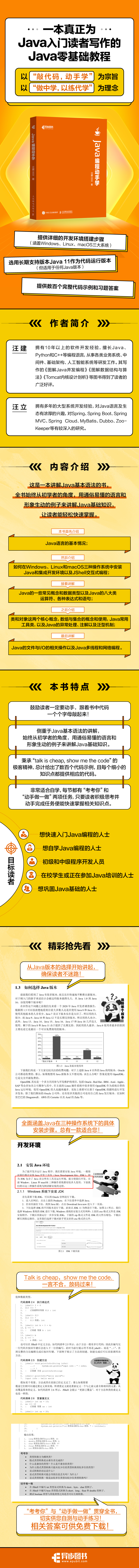 1.本书站在零基础初学者的角度,以“敲代码、动手学”为宗旨,借助于通俗易懂的表达和形象生动的示例,对Java基础知识进行了详细的介绍。 2.本书秉承"talk is cheap, show me the code"的极客精神,全书给出了数百个代码示例,对于每个细小的知识点都提供相应的代码。 3.本书从Java语言的发展史讲起,随后介绍了在三种操作系统上安装Java和集成开发环境的方法、步骤,之后进入本书的核心篇幅,介绍了从Java基础知识到类Java高级特性在内的所有内容。 4.为了保证读者入门Java,本书除了提供数百个代码示例,还带有“考考你”与“动手做一做”两个小版块,可用来检验读者对知识的掌握情况,提升读者的动手编码能力,非常适合自学。