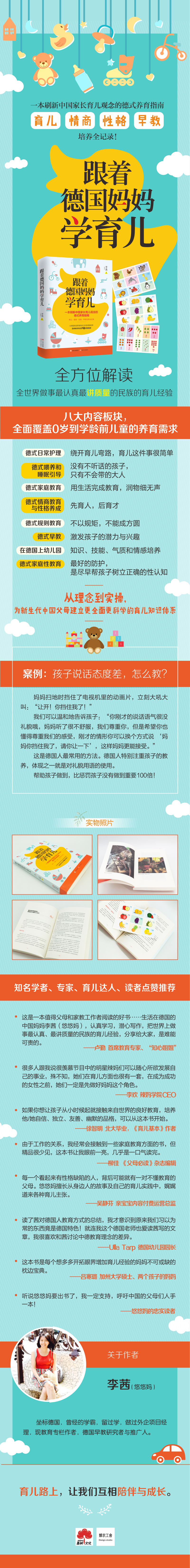 文摘: 自序 刚刚发现自己怀孕的时候,我还在爱尔兰工作。在家庭医生的推荐下,我去了都柏林市中心的一家妇幼医院做产检,第一次去,除了要填很多个人以及家庭健康情况的表格,最让我印象深刻的是,医院给每个孕妇的见面礼是用袋子装好的一整套书。 当时还对怀孕和育儿一无所知的我,一回到家就兴趣勃勃地读起这些书来,里面有关于孕妇饮食营养和孕期保养的,有孕期40周每一周胎儿的发育情况介绍,还有对分娩的准备和分娩过程的介绍,更细心到连临产前去医院要带什么都写进了书里。这些专业书籍给了我巨大帮助。 女儿出生前两个月,我从爱尔兰辞了职,和先生一起搬回德国。很快我们在德国找好了分娩医院,报了产前课程,并参观了产房。周末两天,每天6个小时,足足12个小时的课程,让我和先生对孕期后期身体发生的变化和分娩过程了解得极为详细,也学到了帮助顺产的方法。 2014年6月,我很顺利地在德国医院生下了女儿悠悠。刚刚出院没多久,我们就收到了市政府青少年保护办公室的来信,说要家访。这还是我第一次听说政府工作人员要家访,是访什么呢?我的德国婆婆比我还激动,说一定要在家访时留给工作人员一个好印象,不要让他们觉得我们是不合格的父母。青少年保护办公室的人表面上是来家访,实际上也是趁机考察父母以及家庭居住环境是否适合孩子健康成长,不合格的父母是会被剥夺抚养权的!婆婆还专门送来了一瓶鲜花,嘱咐我一定要摆放在餐桌上。 看来,对待家访一定要严肃点。我和先生把家里打扫得窗明几净,给女儿换上了最漂亮的衣服,等待工作人员的到来。 一位中年女士准时到达。没有我想象中的如警察一般的巡视检查,倒是给我们带来了一书包礼物。打开书包一看,里面全部是育儿书:有0~12个月按月龄每月一封的父母信,讲述每个月龄宝宝的发育情况;有0~1岁和1~6岁的育儿百科;还有一些针对某个专题的书,比如,鼓励妈妈母乳喂养,鼓励父母戒烟,幼儿急救知识,多语启蒙,等等。当然,书包里还有一些送给宝宝的玩具和绘本。 工作人员询问了我们初为人父人母的感受,是否需要帮助,最后留下了一个小册子,上面写的是青少年保护办公室不同部门的电话号码。她告诉我们如果在养孩子上有任何问题或者困难,可以打上面的电话咨询,会有专业人员提供咨询服务,也有父母课程可以上。做父母是需要学习的,而不是天生就会。 这些育儿书籍为我提供了非常全面的育儿指导,比如,从出生开始每天一滴维生素D,一岁前不能使用枕头,等等。那时的我,总是在孩子睡后甘之如饴地从书中汲取科学育儿方法。 德国的儿童医疗系统也很专业,女儿在医院一出生,就收到了一个属于她个人的健康记录册,上面明确写明了从出生到6岁需要做的所有体检和时间,以及每次体检需检查的项目。如果忘记带孩子去体检,还会收到青少年保护办公室的来信,督促父母及时带孩子去体检。每次体检,父母有任何养育方面的问题,都可以提问,从医生那里获得最权威的解答。 悠悠一岁半时去了德国幼儿园的小小班。德国幼儿园的入园适应期足足有一个月时间, 家长在此期间可以每天陪孩子在幼儿园,甚至和老师孩子一起去森林游玩,帮助孩子建立对幼儿园环境以及老师的信任感,这让我有机会近距离一睹德国幼儿园老师的教育方式,亲身体验最真实的德国教育。 这几年,在国内,德国教育备受推崇,不断有国内的朋友在微信上向我发来有关德国教育的文章,询问它们的真实性。我看了那些文章,很多都有夸大事实的成分。可以看出,写那种文章的人,要么自己没有在德国生活过,要么就是为了吸引读者眼球,故意扭曲事实。 这让我内心出现了一股强烈冲动:我要向大家展现一个真实的德国。我在德国学了那么多科学育儿知识,见证了孩子们在德国幼儿园的生活,又在社区早教活动中认识了很多德国父母,领略了德国家庭的养孩理念,这些最一手的经历给我的育儿带来许多启发和帮助,我为什么不把自己亲眼看到、学到的写出来让更多人受益呢? 2016年4月,我开始在微信公众号“德国育儿研究”以“悠悠妈”的网名进行写作,第一篇即是对网络上流传甚广的德国禁止学前教育一文的辟谣。随后我陆续分享了在德国当妈妈的所见所闻、所思所想,内容主要涵盖科学育儿知识、德国家庭教育以及德国幼儿园教育三个方面。 我不喜欢虚无缥缈的描述,再先进的教育理念也要落到细节的执行上才能真正对读者有用,因此我所写的每一篇文章都力求接地气,用最真实生动的例子呈现德国育儿和教育理念。我希望我的文章虽然写的是德国,也能为国内外父母所借鉴,运用在家庭教育中,因此实用是我对自己的要求。 《跟着德国妈妈学育儿》一书收集了我过去两年的精华文章,为了让此书的结构更加科学严谨,系统性更强,我对以前发表的零散文章进行了编辑整理,使得读者读起来能够感受到更清晰的结构,查阅起相关知识点也更加容易。 在科学育儿指导下培养出来的孩子是健康快乐而又完整的。人的心灵既强大又脆弱,幼年时期若被世界温柔对待,长大了自然便能善待别人;若不曾体验过爱与尊重,长大后再多的说教也难以感化一颗冷漠的心。当我们每个家庭都能以科学的方式养育孩子、尊重孩子,未来的社会一定会多出许多内心柔软、充满阳光的人,这样的人越多,社会就会越美好和谐。 