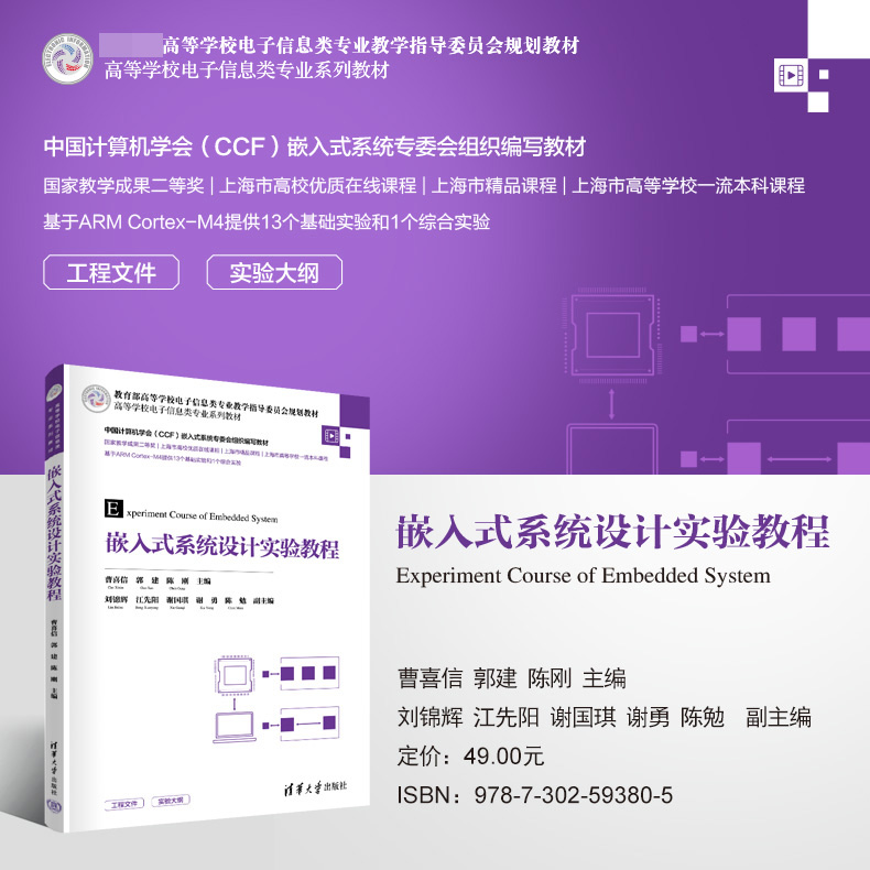 "“嵌入式系统设计”是嵌入式方向的专业基础理论课,而实验实践是加强基础理论学习的必要手段。本书以基于ARM Cortex-M4芯核的典型芯片为例,介绍了嵌入式系统设计中典型的、涉及常规外设的基础实验和综合实验。 作者权威,经验丰富:本书由中国计算机学会(CCF)嵌入式系统专委会组织编写,作者不仅具有嵌入式系统课程的教学经验,同时具有多年嵌入式系统的实践和项目经验。 针对性强,配套使用:本书是《嵌入式系统设计基础及应用——基于ARM Cortex-M4微处理器》的配套实验教材,同时也可以单独作为“嵌入式系统设计”课程的实验教材使用。 实验丰富,讲解透彻:涵盖14个实验,包括嵌入式系统开发环境部署、汇编指令、C语言、GPIO 输入/输出、外部中断、定时器、呼吸灯与PWM 控制、USART通信、I2C通信、实时时钟RTC驱动、实时操作系统移植等13个基础实验,以及1个综合实验。读者 通过阅读硬件手册、学习硬件配置的修改、调试开发板等,完成实验的搭建、代码的编写、代码的下载以及程序在开发板上的运行调试,掌握基于ARM Cortex-M4的常规外设开发,从而提升嵌入式系统开发和设计的能力。 资源齐全,利于教学:提供14个实验完整的工程文件以及实验大纲。"