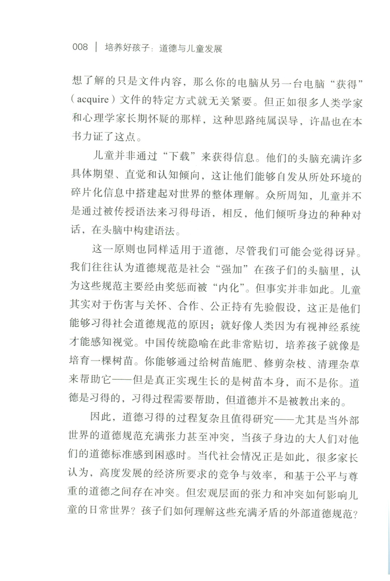 儿童的道德教育与整个社会秩序的进步紧密关联,许晶博士在《培养好孩子》一书中,基于2011年至2012年H市一家中产阶级私立幼儿园120名2~6岁儿童的实地研究,运用人类学民族志观察和心理学实验,从道德领域的三个维度研究了儿童的道德习得过程,展现了儿童与育儿者、儿童世界文化和成人世界文化之间的张力。该书不仅实现了研究方法和学科的融合与跨越,也是对已有儿童道德教育研究的重要补充。对每个教育工作者而言,该书都具有重要的指导和启发意义。