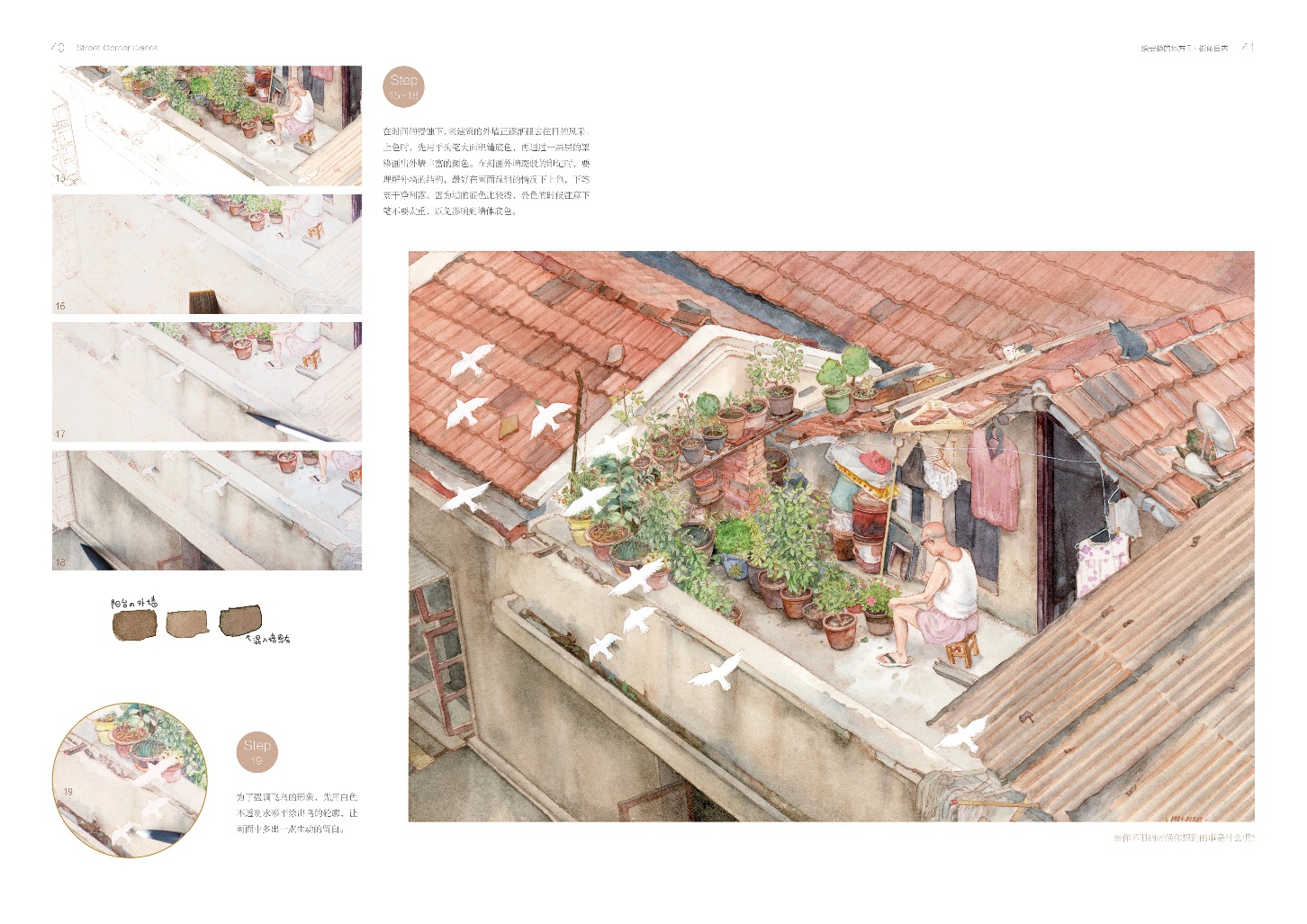街边的落叶,墙角的信报箱,天台的白鸽…… 街头巷尾的欢乐孩童,晾衣杆下的家长里短 仿佛所有的记忆,都浓缩在这条小小的老街里,不曾离去。 从用纸、画笔、色卡基础入手,超实用教学视频步骤详解, 带你玩转干湿、渐变、晕染等多种技法! 《绘安静的地方Ⅱ?街角日志——米莫水彩教程》 2019初秋,暖心上市! 带你游走在城市的角落里,寻找关于青春的记忆