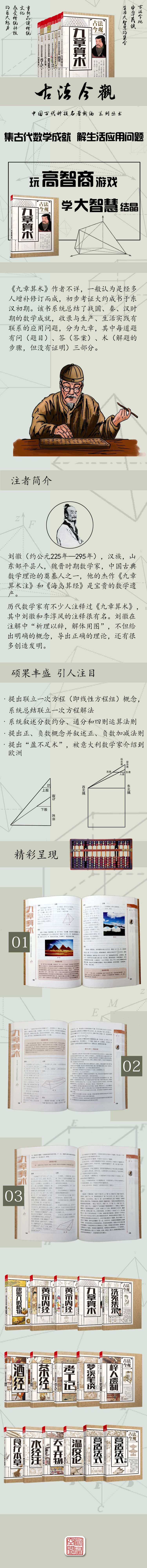 数学, 作为人类思维的表达形式, 反映了人们积极进取的意志、缜密周详的推理及对**境界的追求。中国是世界文明古国之一。数学是中国古代科学中一门重要学科,其发展源远流长,成就辉煌。《九章算术》是中国古代的数学专著,是算经十书中*重要的一种,也是一种可以提高智商的中国古代的数字游戏。该书系统总结了战国、秦汉时期的数学成就。全书采用问题集的形式,收有200多个与生产、生活实践有联系的应用问题,其中每道题有问(题目)、答(答案)、术(解题的步骤,但没有证明),有的是一题一术,有的是多题一术或一题多术。本书对其原典进行了精准的注释和翻译,方便读者进一步了解中国古代在数学方面的**水平。由此,使本书既具有科学的实用性,也具有一定的文化性。
