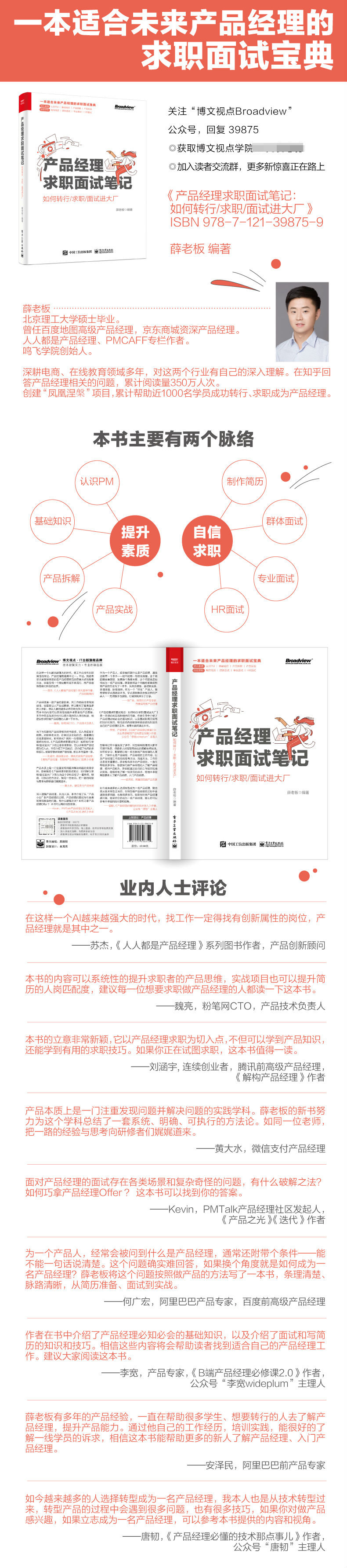 一本适合未来产品经理的求职面试宝典 提升素质:认识PM—基础知识—产品拆解—产品实战 自信求职:制作简历—群体面试—专业面试—HR面试