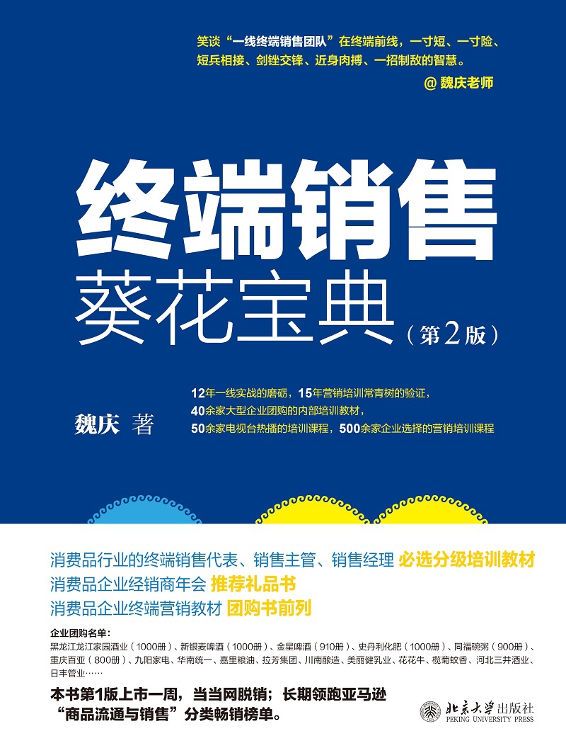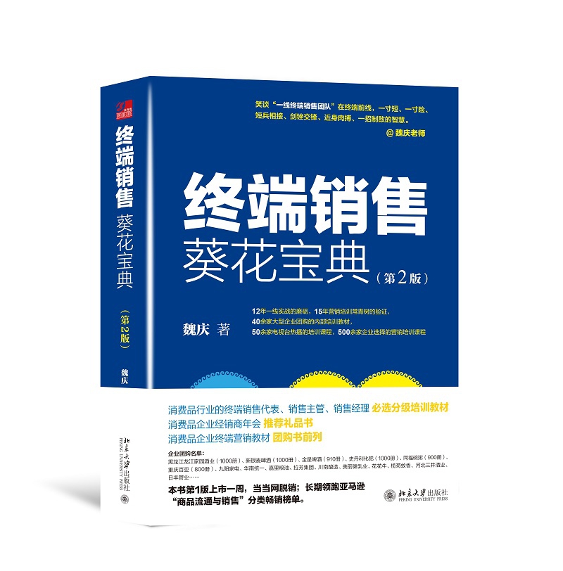 魏庆,从基层业务代表做起,历任可口可乐业务代表、销售主任、销售经理,顶新国际集团产品经理,某内资企业销售总监。 2002年进入营销培训咨询行业,营销培训界15年常青树,先后为可口可乐、统一企业、嘉里粮油、美的集团、TCL集团、九阳家电、立白集团、恒安集团、拉芳家化、康佳集团、联想集团、金正大股份有限公司、史丹利化肥、中国石油、双汇集团、大自然木地板、圣象壁纸、西顿照明、欧普照明、富安娜家居、民生银行等国内外500余家企业提供营销培训和辅导。 出版四本营销专著《经销商完全手册》《新品上市完全手册》《经销商管理动作分解培训》《终端销售葵花宝典》(第1版)。其中《终端销售葵花宝典》(第1版),上市一周,广受欢迎;长期领跑亚马逊“商品流通与销售”分类畅销榜单;且被多家知名企业团购作为内部营销教材。兼任《商界·中国商业评论》特约编委。
