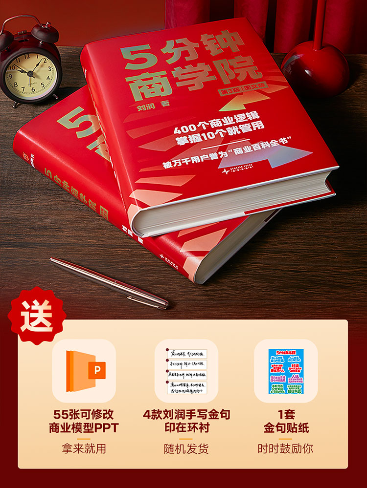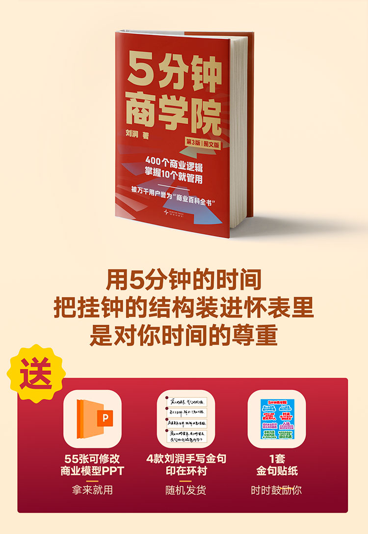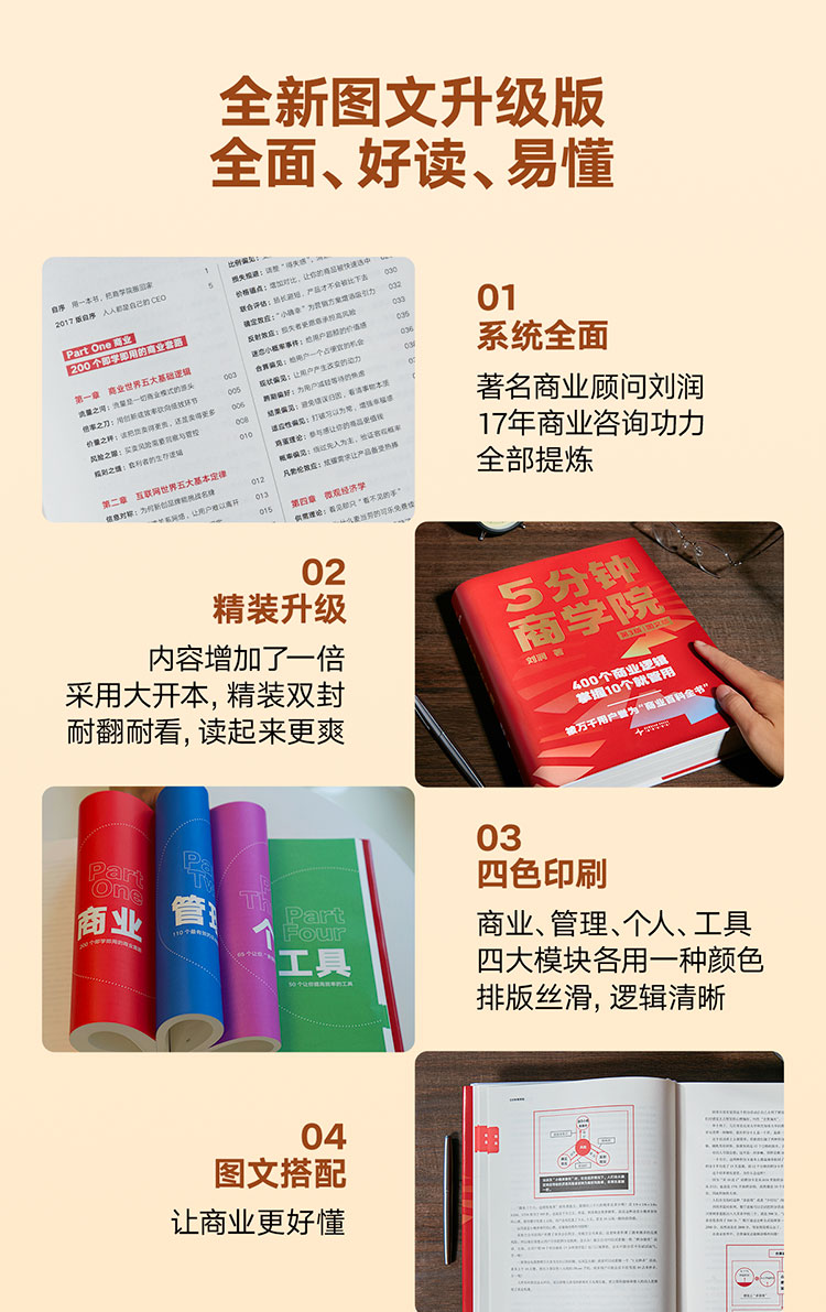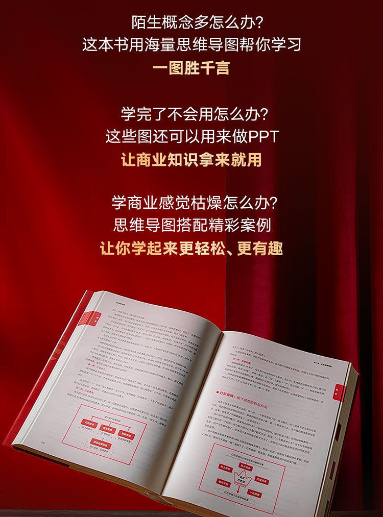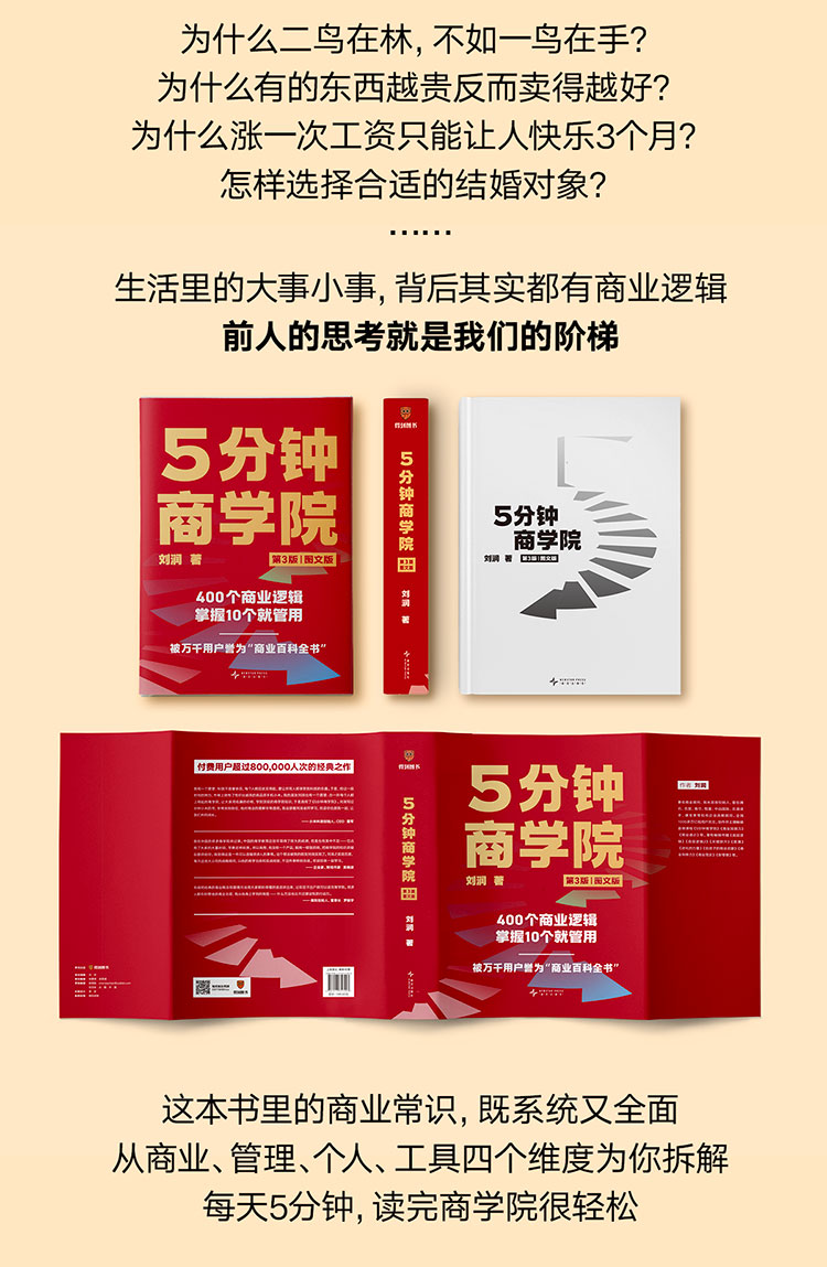 1.文本特点 通俗易懂,可读性强; 用简单的故事和案例讲解专业术语,完全不晦涩; 配有近400幅思维导图,一张图读懂几千字的内容,便于理解和吸收。 2.装帧特点 精装大开本、内文四个部分采用不用的颜色进行双色印刷,设计精美,适合摆在书架上作为“镇宅之宝”; 内文采用80克纯质纸,不伤眼、不透字。 每本书单独飞机盒包装,带提手,精美设计。 3.现实意义 商业常识是每个职场人必备的武器,《5分钟商学院》就是职场人的武器库; 没有哪家公司可以待一辈子,只有像经营公司一样来经营自己,才能保障长久的职业安全。