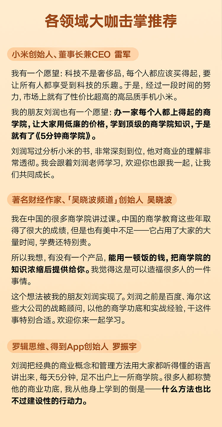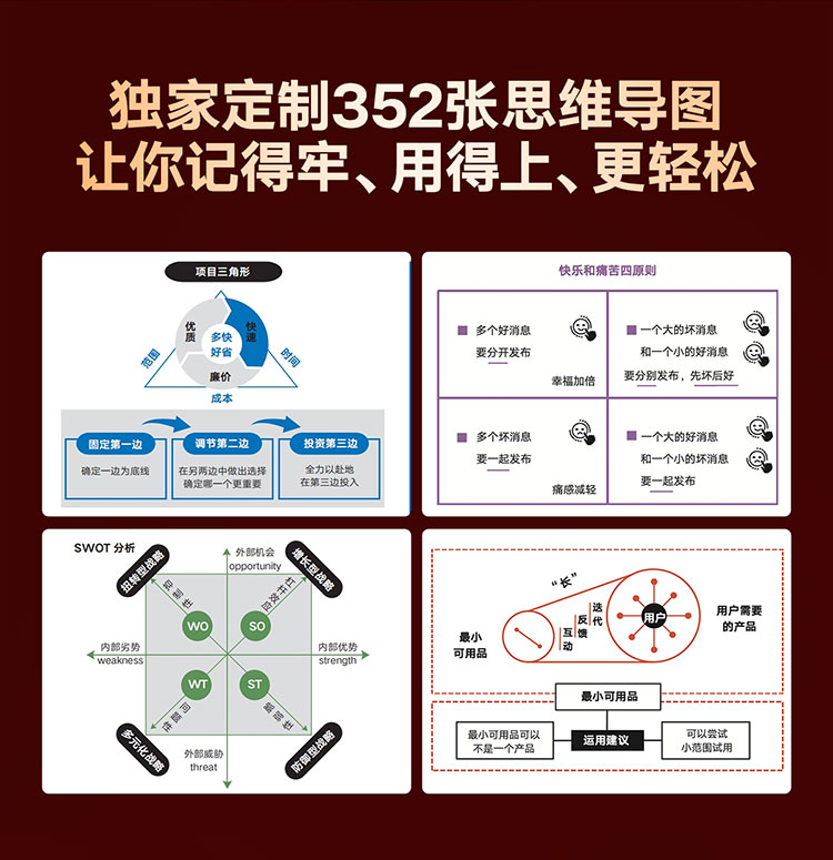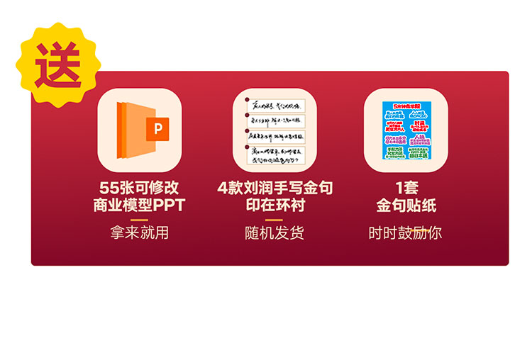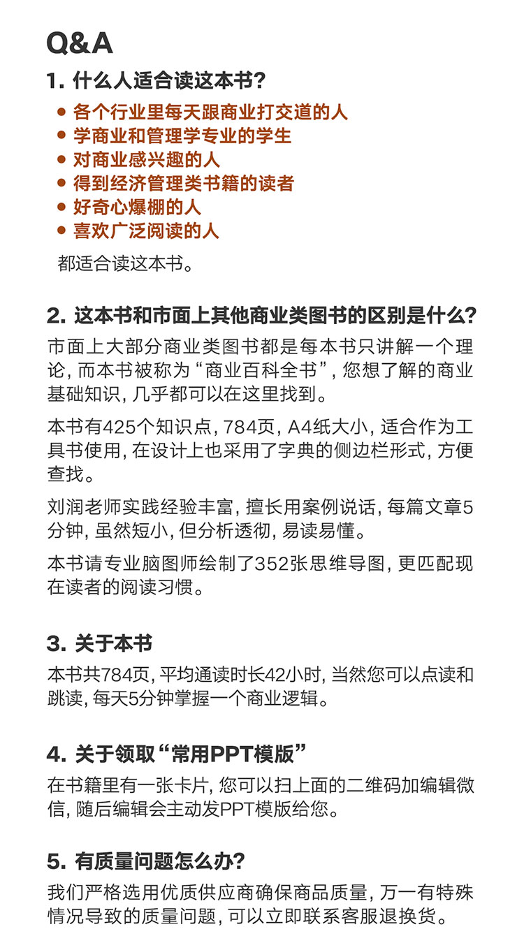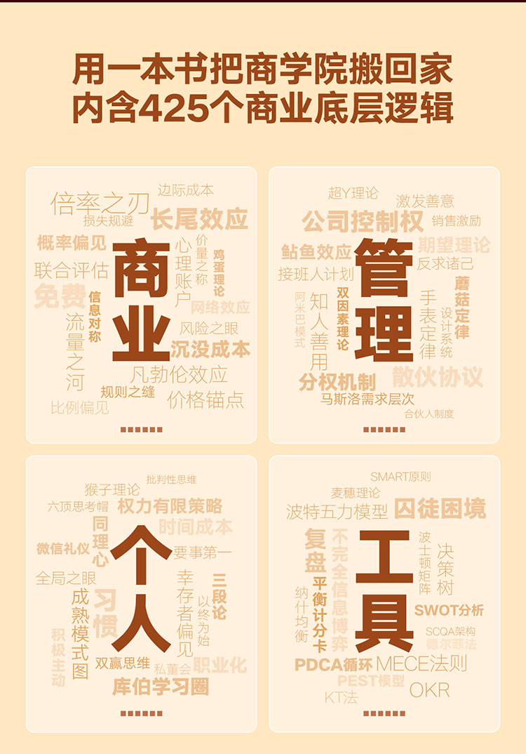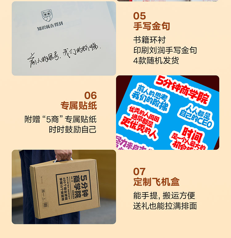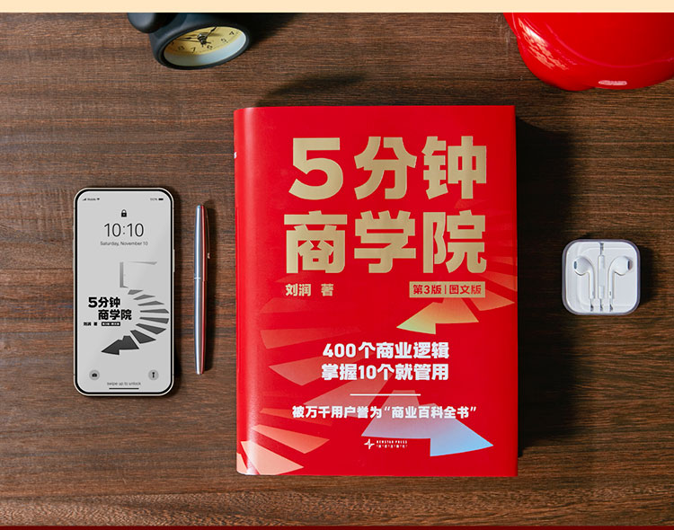 1.文本特点 通俗易懂,可读性强; 用简单的故事和案例讲解专业术语,完全不晦涩; 配有近400幅思维导图,一张图读懂几千字的内容,便于理解和吸收。 2.装帧特点 精装大开本、内文四个部分采用不用的颜色进行双色印刷,设计精美,适合摆在书架上作为“镇宅之宝”; 内文采用80克纯质纸,不伤眼、不透字。 每本书单独飞机盒包装,带提手,精美设计。 3.现实意义 商业常识是每个职场人必备的武器,《5分钟商学院》就是职场人的武器库; 没有哪家公司可以待一辈子,只有像经营公司一样来经营自己,才能保障长久的职业安全。
