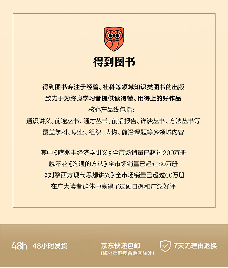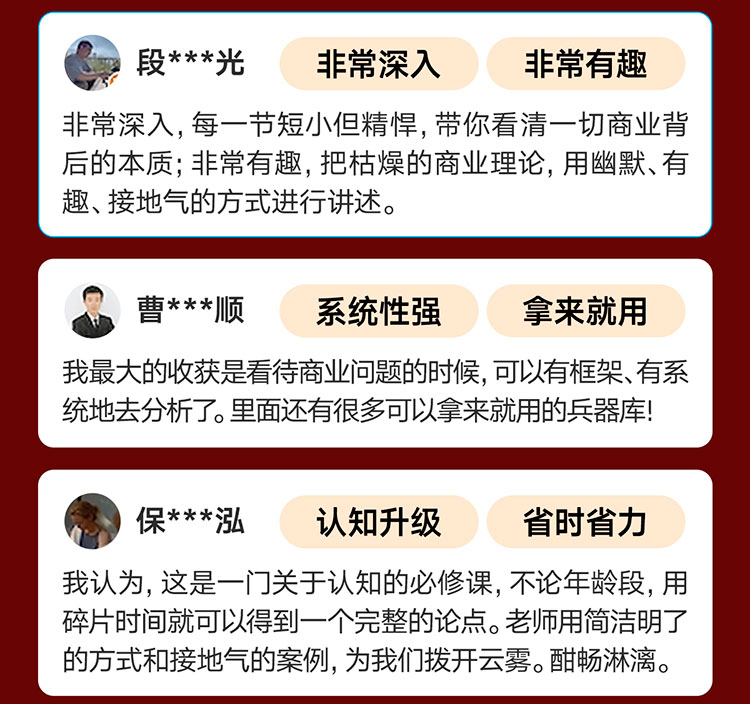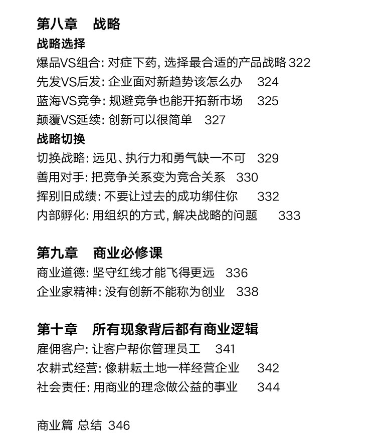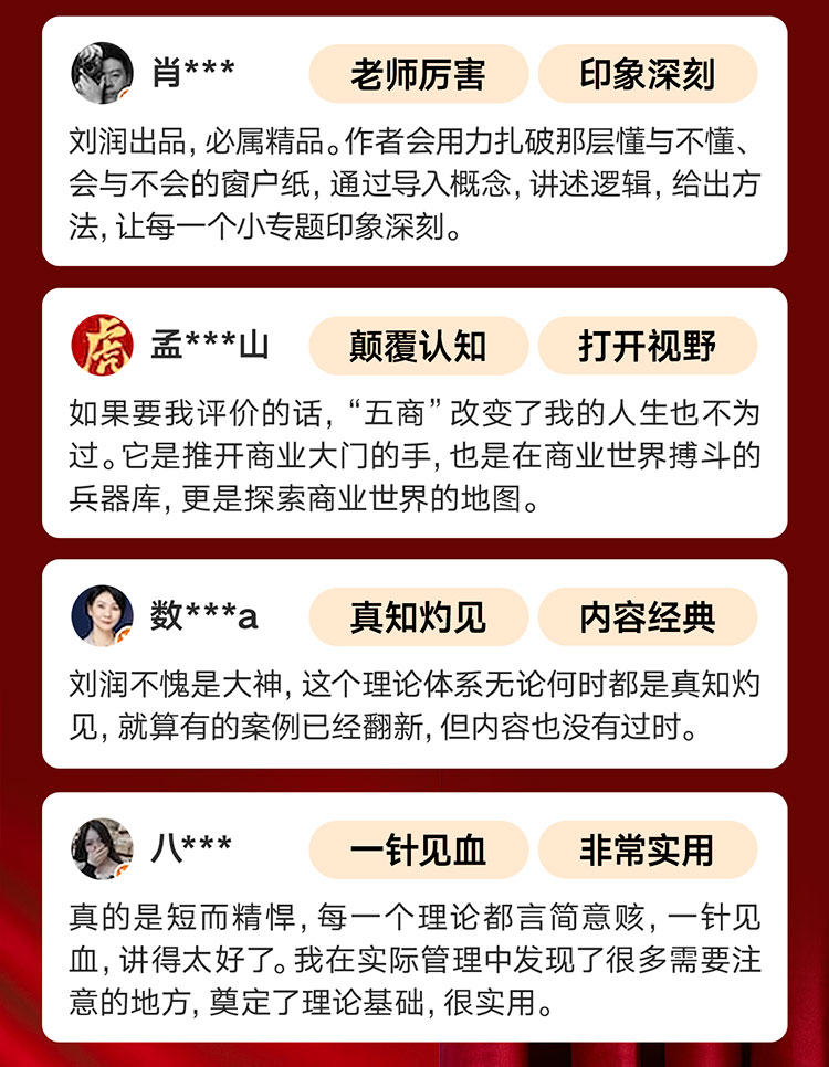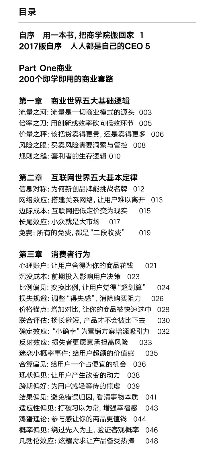 1.文本特点 通俗易懂,可读性强; 用简单的故事和案例讲解专业术语,完全不晦涩; 配有近400幅思维导图,一张图读懂几千字的内容,便于理解和吸收。 2.装帧特点 精装大开本、内文四个部分采用不用的颜色进行双色印刷,设计精美,适合摆在书架上作为“镇宅之宝”; 内文采用80克纯质纸,不伤眼、不透字。 每本书单独飞机盒包装,带提手,精美设计。 3.现实意义 商业常识是每个职场人必备的武器,《5分钟商学院》就是职场人的武器库; 没有哪家公司可以待一辈子,只有像经营公司一样来经营自己,才能保障长久的职业安全。