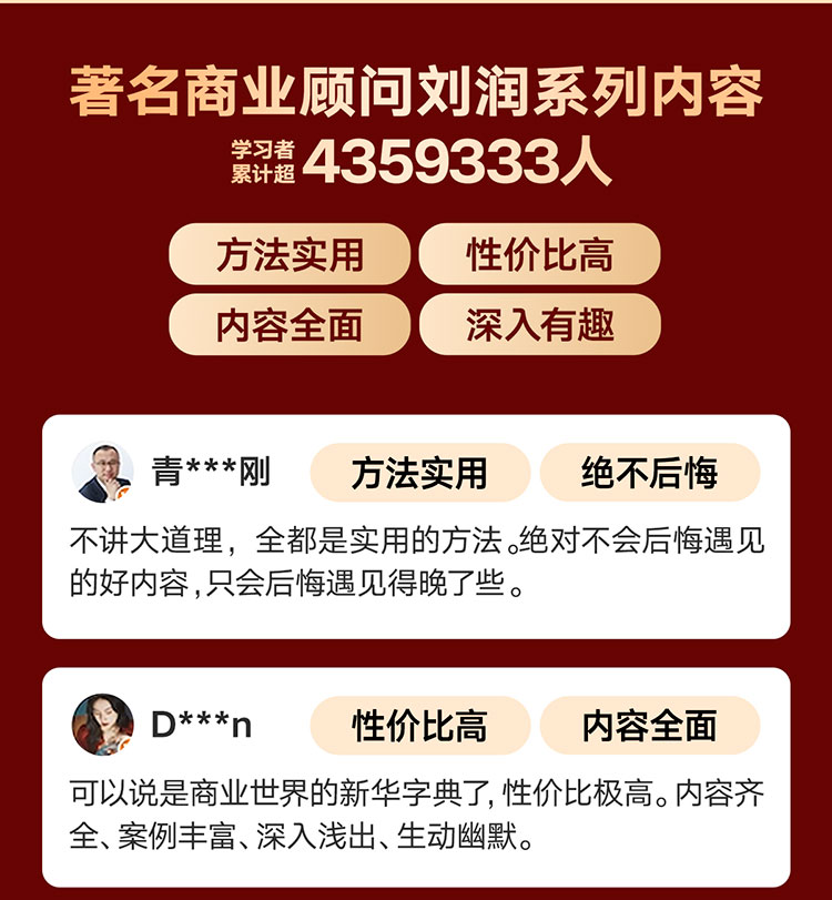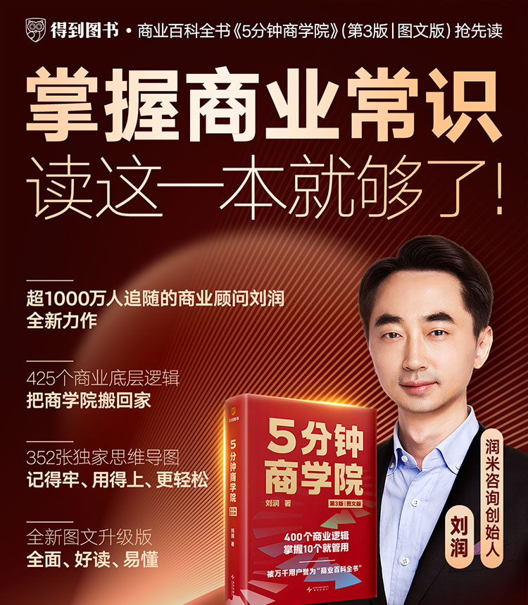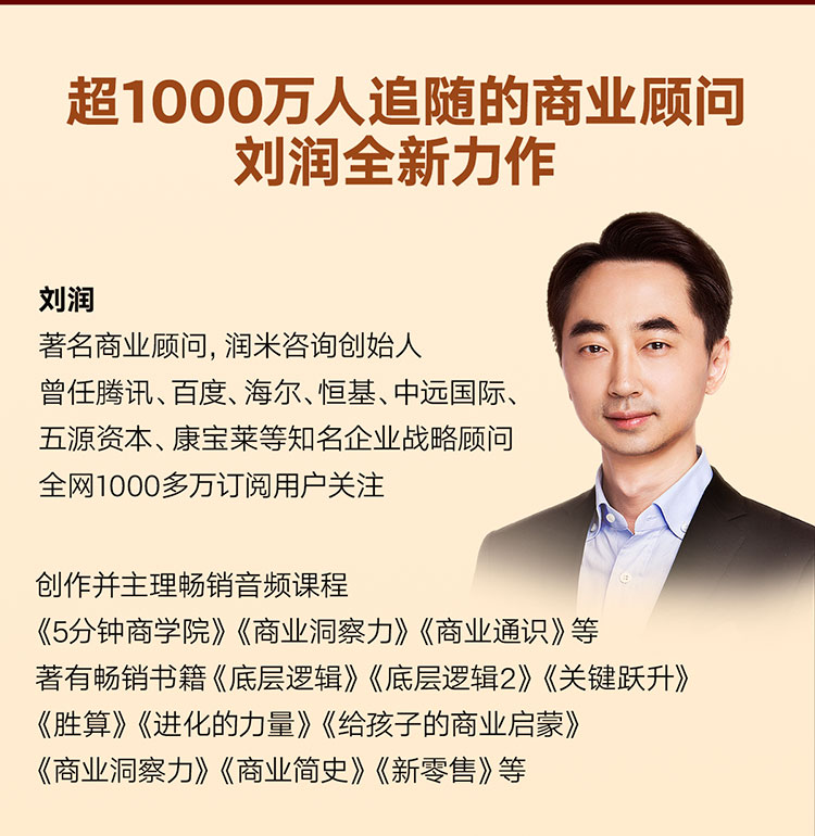 刘润 著名商业顾问,润米咨询创始人,曾任腾讯、百度、海尔、恒基、中远国际、五源资本、康宝莱等知名企业战略顾问。 全网1000多万订阅用户关注。 创作并主理畅销音频课程《5分钟商学院》《商业洞察力》《商业通识》等。著有畅销书籍《底层逻辑》《底层逻辑2》《关键跃升》《胜算》《进化的力量》《给孩子的商业启蒙》《商业洞察力》《商业简史》《新零售》等。