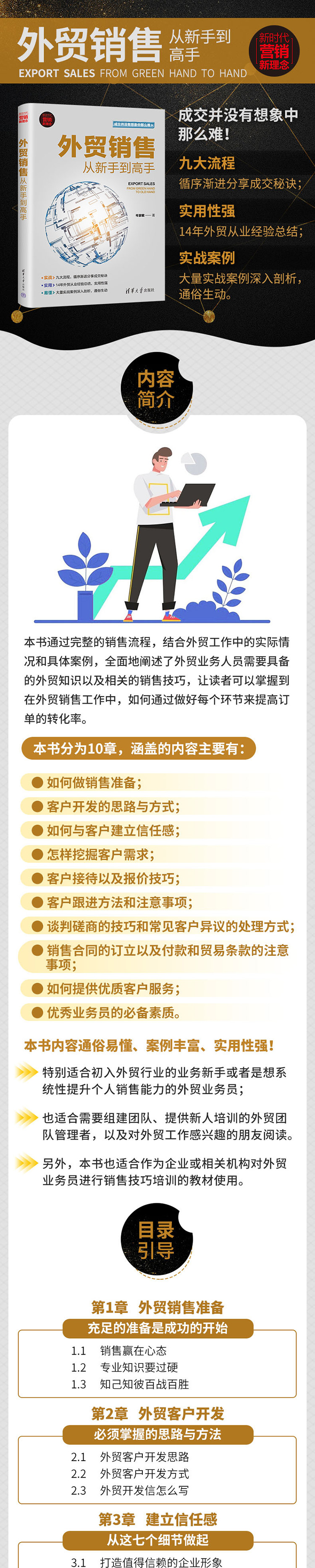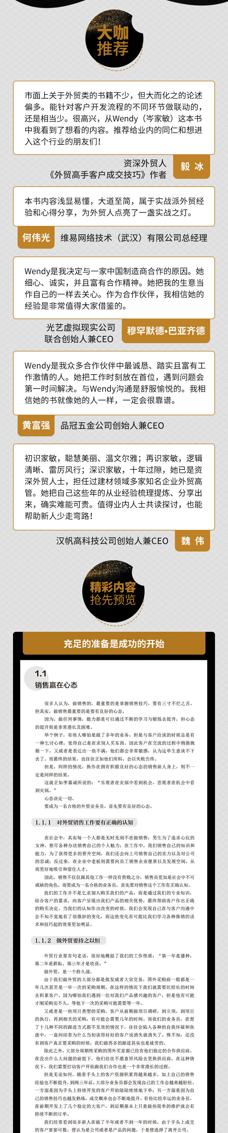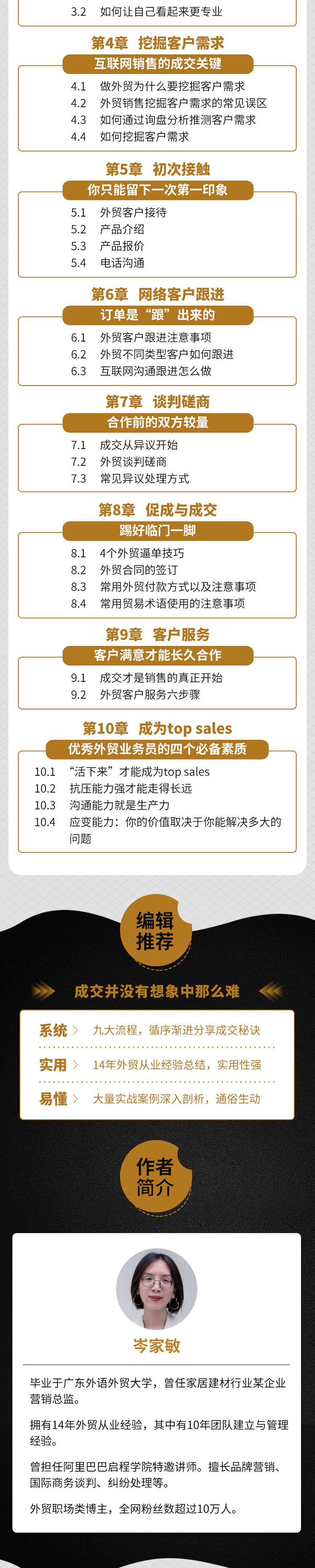 "成交并没有想象中那么难 系统:九大流程,循序渐进分享成交秘诀 实用:14年外贸从业经验总结,实用性强 易懂:大量实战案例深入剖析,通俗生动 "