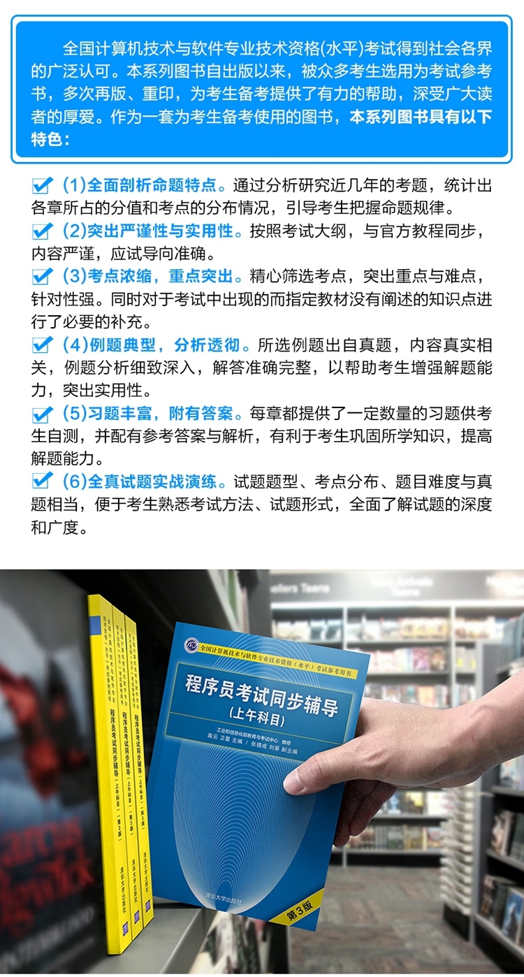 \"全国计算机技术与软件专业技术资格(水平)考试得到社会各界的广泛认可。本系列图书自出版以来,被众多考生选用为考试参考书,多次再版、重印,为考生备考提供了有力的帮助,深受广大读者的厚爱。作为一套为考生备考使用的图书,本系列图书具有以下特色: (1) 全面剖析命题特点。通过分析研究近几年的考题,统计出各章所占的分值和考点的分布情况,引导考生把握命题规律。 (2) 突出严谨性与实用性。按照考试大纲,与官方教程同步,内容严谨,应试导向准确。 (3) 考点浓缩,重点突出。精心筛选考点,突出重点与难点,针对性强。同时对于考试中出现的而**教材没有阐述的知识点进行了必要的补充。 (4) 例题典型,分析透彻。所选例题出自真题,内容真实相关,例题分析细致深入,解答准确完整,以帮助考生增强解题能力,突出实用性。 (5) 习题丰富,附有答案。每章都提供了一定数量的习题供考生自测,并配有参考答案与解析,有利于考生巩固所学知识,提高解题能力。 (6) 全真试题实战演练。试题题型、考点分布、题目难度与真题相当,便于考生熟悉考试方法、试题形式,全面了解试题的深度和广度。 \"