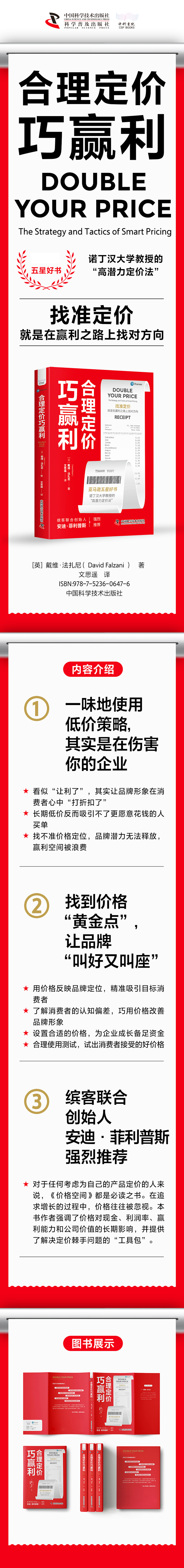 "本书将会探讨智能定价法的战略和战术。读者可以通过本书了解如何进行定价以及如何避免定价中的常见错误,例如由于认知偏差导致的错误。在本书中,你将看到关于如何制定和管理价格的见解、工具和指导,了解何时以及如何合理地制定较高的价格。本书还将帮助你了解如何在自己的企业中,创建具有价值导向的企业文化,如何与他人谈论定价战略,并达成共识。 因此,本书面向的读者群体包括企业经理、企业主、企业家和学生。总而言之,只要你希望拓展业务(无论是从零开始还是已有基础),并且对如何通过智能定价法来实现这一目标感兴趣,本书都是你的不二选择。只要合理采取智能定价法,企业便无须募集新的投资资金——如寻求银行贷款或向投资者出售股票。这些活动耗时长久且耗资巨大,通常是企业发展中必不可少的环节。 本书的写作目的主要是帮助企业避免出现重大问题,这在大大小小的企业合作中屡见不鲜:定价过低或定价不高。企业在初期发展阶段常出现这种失误,许多历史悠久的企业也不例外,这也是企业在成功之路上会遇到的巨大阻碍。通常情况下,所有定价都有自己的“甜蜜点”。定价可能偏高,也可能偏低,较常见的情况是定价偏低。在考虑如何看待特定价格时,企业往往会低估定价“框架效应”的重要性。 价格是决定成长型企业能否生存和繁荣的关键因素之一,但人们尚未充分认识到定价过低的危害。这种长期存在的盲点不仅会严重威胁到成长型企业的发展,甚至还会危及国家层面的社会和经济健康。 因此,无论是大型企业还是小型企业,重新审视定价并采用智能定价法都是一桩划算的买卖。 在任何国家,初创企业和中小企业通常都是市场中的创新者。它们代表着高增长的前沿力量,是提高国民生产力、保持经济良好状态的强大动力,可以帮助我们解决面临的许多问题。在英国,初创企业和中小企业占据企业总数的99%,提供了60%的私人部门就业岗位,贡献了超过50%的年营业额。在美国,3000万家中小企业提供了近三分之二的私人部门新增就业岗位,即美国就业岗位总数的一半。 初创企业和中小企业也是大型企业创新发展的关键驱动力,为大型企业提供创新解决方案和新技术。 认知偏差往往会促使初创企业的所有者和大型企业的管理者加入价格战,而非注重产品或服务的质量。在本书中,作者将重点探讨价格问题,旨在通过解释和纠正这种认知偏差,为小型企业和大型企业提供切实支持。我们会发现,“以质取胜”方为上策,而“打价格战”往往会以失败告终。 读完本书后,你将了解为什么价格在现实中既具有价值意义,又具有战略意义。你将了解价格问题为什么值得重视,为什么价格对所有企业的生存和发展都至关重要。有些企业只制定一次价格,或者每年制定一次价格——你将了解这种普遍做法为什么是错误的,而且从商业角度来看可能是致命的。 本书将回答以下问题: ●? 我们应该为自己的产品或服务收取多少费用? ●? 我们的客户愿意支付多少费用? ●? 如果提高价格,我们会流失客户吗? ●? 如何制定价格可以帮助我们收回成本? ●? 定价战略有什么优点? ●? 提高或降低价格会帮助我们在业务上取得成功吗?" "亚马逊五星好书 诺丁汉大学教授的“高潜力定价法” 帮你找准定价,赢在赢利之路 推荐1:帮读者认识到一味实用定价策略有害于企业,建立合理的定价观。 推荐2:巧妙利用定价,找到价格“黄金点”,让品牌“叫好又叫座”。 推荐3:缤客联合创始人安迪·菲利普斯强烈推荐。"