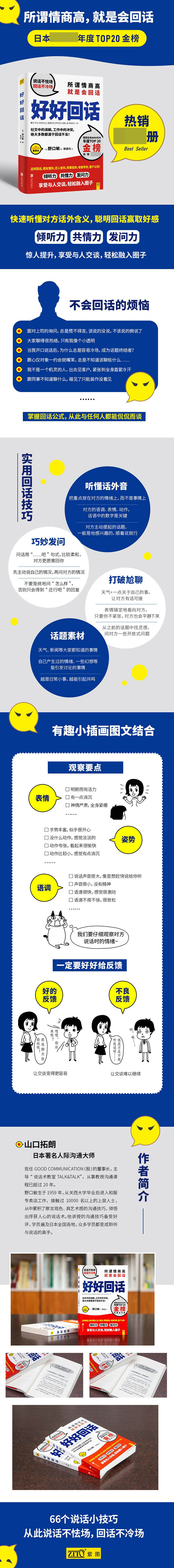 ★日本AMAZON年度TOP20金榜,热销量100万册 ★日本著名人际沟通大师野口敏,超20年沟通教学经验 ★有趣小插画图文结合,读起来不费力,用起来很给力 ★66个回话技巧,涵盖职场、交友、恋爱、家庭等各类场合 如何听懂对方的话外音 善于倾听的人,会把重点放在“对方的情绪”上,然后给予对方适合当下情绪的反馈。事实上,对方最想让你知道的并不是“整件事是怎么回事”,而是“他当时的感受”。 如何巧妙发问,获得有效信息 问及对方的负面情绪,特别是问“你也有心里不爽的时候吧”时,对方会忍不住对你倾诉。运用“……吧”句式,柔和地提问,可以帮你开启一段愉快的交谈。 如何打破尬聊,不再当“冷场王” 围绕对方提出的话题,他会更愿意跟你聊;天气+一点关于自己的事,让对方有话可接;眼睛看到的任何东西都可成为话题。