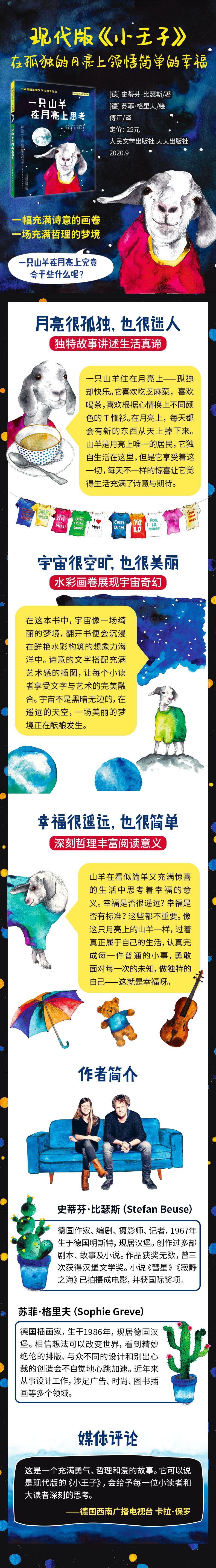 名字 在月亮上,每一样东西都有个美丽的名字。芝麻菜叫作芝麻菜,墨西哥草帽叫作墨西哥草帽,咖啡配煎鸡蛋在这里也被称为世界上最美味的早餐。月亮上没有什么叫作瓶颈、成本控制或者时间压力的东西,因为月亮上的一切都是事物最本初的样子。如果你是月亮上唯一的山羊就好了!你不必顾及其他人,可以做任何你想做的事情,如果你想花大半天的时间躺在尘土中听星星们说悄悄话,那你就可以这么做,因为你是月亮上唯一的山羊。 最深的火山口 那些好看但没有用的东西需要特别注意。例如那个装着小木棍的盒子,用小木棍在盒子上摩擦就能产生光亮和温暖。山羊很喜欢那忽隐忽现的光亮和温暖,但那噼里啪啦的声音和蹿进鼻子的味道会使它产生一种奇怪的感觉。这很危险,因为它会突然很想跑去其他地方,这可不太好。想要去其他地方,而不是留在自己所在的地方;想要做其他事情,而不是专注于自己正在做的事情,这些都是你变得不快乐的开始。出于山羊的天性,它的快乐比不快乐要多得多。它会把有可能带来危险的东西都扔到它看不到的地方——离它屋子最远的那个最深的火山口里面。 月亮上的时间 在月亮上,时间是很特别的东西。一只钟表落在了山羊的小屋旁,这只钟表不走了,它穿越宇宙,飞行了数十万公里,它的指针永远指向九点一刻。九点一刻刚好是世界上最好的时间。九点一刻,你可以慢腾腾地起床,从一顿美味的早餐开始,对新的一天充满期待。最棒的是,你经历了充满冒险的一天之后回到家,正好是九点一刻,这是世界上最好的晚餐时间了。你可以把星星想象成一条条小鱼,直到疲倦得昏昏欲睡。之后,你又会走进如湖水一般清澈而平静的梦境,梦到水中那些褪去了颜色、改变了形状的东西。 山羊必须无所畏惧 山羊要去找那个巨大的东西,一路上,它的心情很放松,因为它过着世界上最美好的生活。它享用了美味的早餐,迎接着充满冒险的一天,而且它已经做好了准备。做好充分的准备是在月亮上生活的关键,特别是当你要开始一次探索未知的旅行时。 山羊穿上了一件代表勇气的T恤衫。充满勇气总是不会出错的,尤其是要检查外来物品的时候。它还想象了一下有可能会发生的最糟糕的事。最糟糕的事就是它可能会喜欢上这件新东西,想把它带回家,可又发现家里没有地方放,因为到处都堆满了各种各样的东西。然后山羊考虑了一下如何处理这种情况。解决方法是:把那个巨大的东西留在那儿。因为确切地说,整个月亮都是它的家,有时候,只要把东西在脑海中移动一下就可以了,没必要真的去移动它。这样,问题就解决了。 1. 国际大奖作品,保证优质阅读体验 2. 独特故事内容,感悟成长、放飞想象 3. 现代版《小王子》,揭示深刻生命哲理 4. 细腻水彩插图,打开诗意艺术画卷