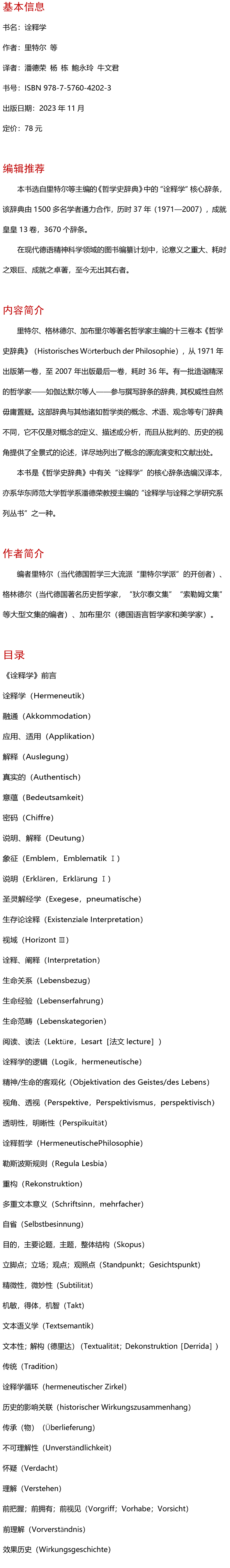 潘德荣,德国鲁尔大学哲学博士。现为华东师范大学二级教授、博士生导师、校学位委员会副主席,哲学系博士后流动站站长,兼任华东师大-耶拿大学人文社科联合研究中心主任,华东师大涵静书院院长,觉群佛教文化研究所所长。主要研究领域为诠释学、认识论。已发表中、英、德文论(著)150余篇(部)。 鲍永玲,华东师范大学哲学博士,复旦大学哲学博士后,德国洪堡大学哲学博士后。现任上海社会科学院哲学研究所研究员,《中西哲学论衡》副主编,主要从事德国思想史、宋明理学和中西哲学比较研究。受中国国家留学基金委、德国DAAD奖学金和中国博士后科学基金资助,曾在德国柏林理工大学、波茨坦大学和洪堡大学访学。著有《“种子”与“灵光”:王阳明心学喻象体系通论》(上海市学术著作出版基金资助出版),主持省部、院校等各级科研项目十余项,在国内外学术刊物上发表论、译文三十余篇。 牛文君,德国耶拿大学哲学博士,现任华东师范大学哲学系副教授,主要研究领域和学术兴趣为诠释学、德国古典哲学。出版学术专著Hermeneutik gegen Methode? Probleme und Perspektiven (K?nigshausen &Neumann, 2015),在《哲学研究》、《哲学动态》、《世界哲学》、《安徽师范大学学报》等刊物上发表若干学术论文、译文,主持国家社科基金、上海浦江人才计划、上海哲学社会科学等科研项目。 杨栋,德国弗莱堡大学哲学博士在读,西安交通大学马克思主义学院国外马克思主义研究所讲师。曾就学于中国科学技术大学热科学与能源工程系以及科技传播与科技政策系(2003-2008年)、上海社会科学院哲学研究所(2008-2011年)和华东师范大学哲学系(2011-2012年)。研究方向为现象学、诠释学和国外马克思主义研究。已发表相关论文数篇。