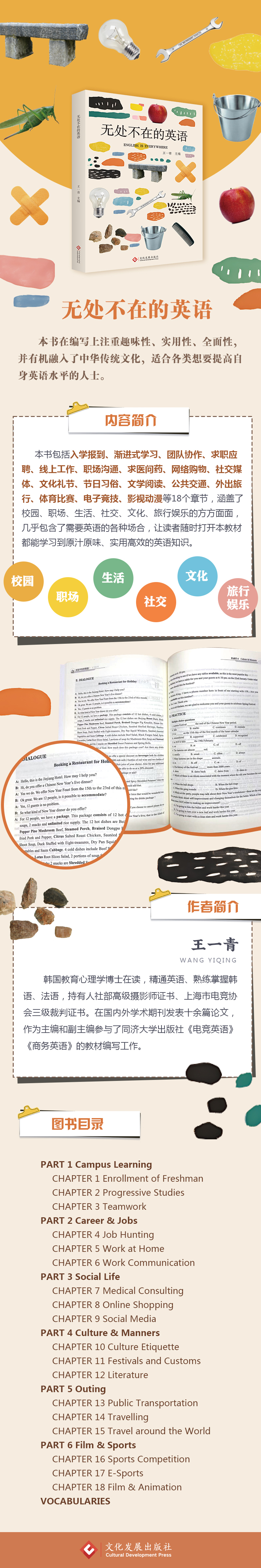 无处不在的英语 出版时间 2024-06-01T00:00 其他类别 45637 作者: 王一青 出版社: 文化发展 原售价: 59.00 折扣价: 43.10 折扣购买: 无处不在的英语 ISBN: 9787514243192 作者简介 王一青,韩国教育心理学博士在读,精通英语、熟练掌握韩语、法语,持有人社部高级摄影师证书、上海市电竞协会三级裁判证书。在国内外学术期刊发表十余篇论文,作为主编和副主编参与了同济大学出版社《电竞英语》、《商务英语》的教材编写工作。 内容简介 上一篇:众包平台用户持续知识贡献行为研究/十三五科学技术专著丛书下一篇:黄河流过我的家——石嘴山行记