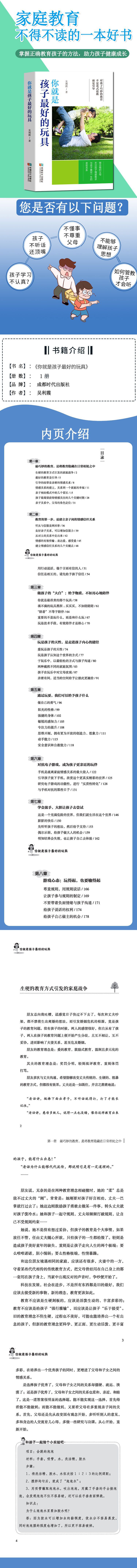 你就是孩子最好的玩具 出版时间 2020-11-01T00:00 幼儿园/学前教育 28073 作者: 吴利霞 出版社: 成都时代 原售价: 39.80 折扣价: 19.90 折扣购买: 你就是孩子最好的玩具 ISBN: 9787546426815 作者简介 内容简介 1、这个世界上巧妙的教育,不是花式说教,而是引导。 2、育儿即是育己,学会一定的方式方法,不仅仅是在帮助孩子,也是为了成为更好的自己。 3、任何时候改善亲子关系都不晚,只要我们愿意行动起来,用正确的方式引导孩子。 4、书中许多生动地案例,会让你懂得发挥情感式引导教育的功效,文字通俗,论述清晰,感悟性深,可读性强。? 上一篇:(高职高专)学前儿童社会教育活动指导(第二版)(学前教育专业系列规划教材)下一篇:幼儿数学思维训练(6)