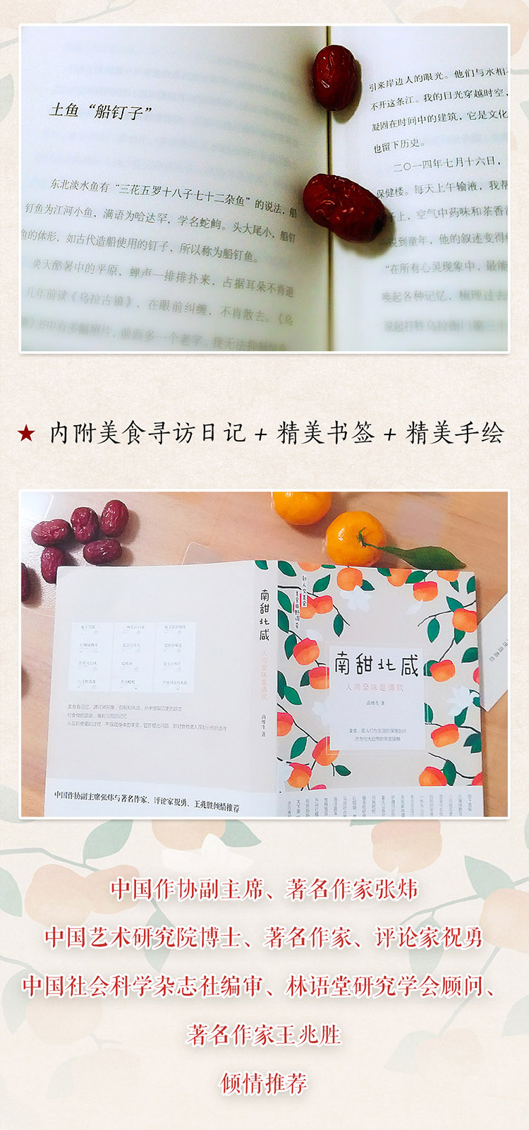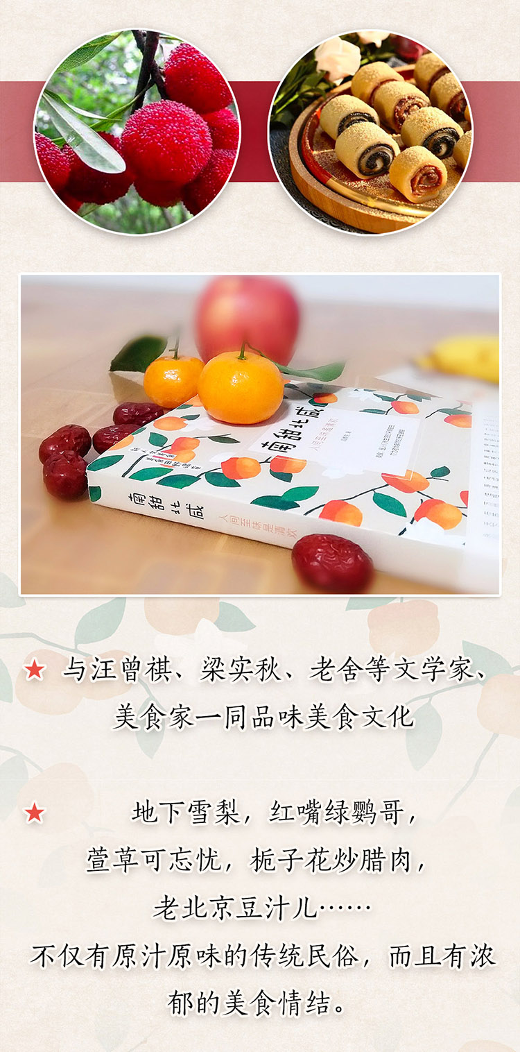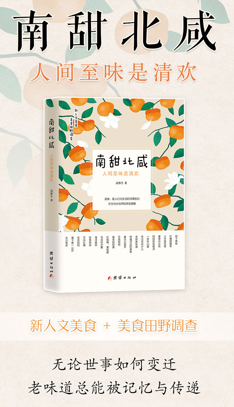 ★ 美食田野调查 + 新人文美食作品 ★ 以南北美食为载体,寻访美食故乡的亲身经历、记忆中的故事与食味 美食有记忆,通过其形象、创制和味道,从中提取历史的踪迹 ★ 与汪曾祺、梁实秋、老舍等文学家、美食家一同品味美食文化 ★ 地下雪梨,红嘴绿鹦哥,萱草可忘忧,栀子花炒腊肉,老北京豆汁儿……不仅有原汁原味的传统民俗,而且有浓郁的美食情结。无论世事如何变迁,老味道总能被记忆与传递 ★ 古有“云想衣裳,花想容”“日啖荔枝三百颗,不辞长作岭南人” 今有唯美食与爱不可辜负 美食便是人们与生活的最深情表白 亦为与大自然的最亲密接触 ★ 内附美食寻访日记 + 精美书签 + 精美手绘 ★ 中国作协副主席、著名作家张炜 中国艺术研究院博士、著名作家、评论家祝勇 中国社会科学杂志社编审、林语堂研究学会顾问、著名作家王兆胜 倾情推荐 ★ 新人文美食书系 南咸北甜:人间至味是清欢 老味道:亲吻味蕾里的乡愁 粗茶淡饭:梅子金黄杏子肥 南食记:长沙味道