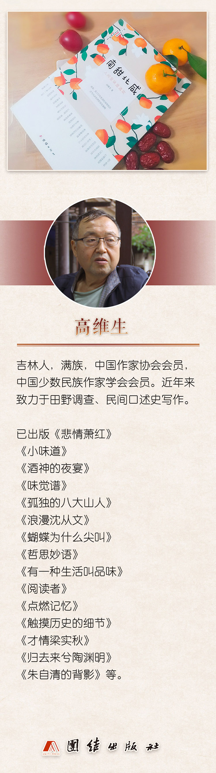 高维生 吉林人,满族,中国作家协会会员,中国少数民族作家学会会员,记者。近年来致力于田野考查、民间口述史写作。 已出版《悲情萧红》《小味道》《酒神的夜宴》《味觉谱》《孤独的八大山人》 《浪漫沈从文》《蝴蝶为什么尖叫》《哲思妙语》《有一种生活叫品味》《阅读者》 《点燃记忆》《触摸历史的细节》《才情梁实秋》《归去来兮陶渊明》《朱自清的背影》等,诗集《夜的大衣》。主持《文学教育》新作快递,主编《大散文》《独立文丛》等书系。